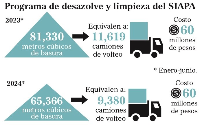 El desazolve en la Zona Metropolitana de Guadalajara disminuyó este año, con base en información difundida por el SIAPA. Entre enero y junio de 2023, se retiraron 81 mil 330 metros cúbicos de desechos de los canales, bocas de tormenta y zonas inundables. Sin embargo, en el mismo periodo de este año fueron 65 mil 366.“En cada tormenta se observa que en el canal baja mucha basura. No limpiaron o están aventando mucha basura cuando llueve”, comenta Rodolfo Macías, vecino de El Briseño, quien pide una solución para evitar problemas ocasionados por el arroyo Seco.La reducción de estos trabajos coincide con un temporal que deja a la ciudad más vulnerable. Este año, el Mapa Único de Inundaciones sumó 15 nuevos puntos de inundación recurrente en la metrópoli, por lo que totalizan 371 zonas con este tipo de problemas en Guadalajara, Tlaquepaque, Tlajomulco y Zapopan.Para Fernando Rueda Lujano, especialista en el manejo de recursos hídricos, es la basura dentro de los canales y arroyos lo que colapsa los cauces, generando socavones o arrasando con viviendas, puentes o colectores, ya que los desechos disminuyen las capacidades de que el agua corra libremente. “Nuestros cauces y canales se han convertido en basureros. Y esto genera taponamientos que no permiten que las aguas fluyan como deberían. Por eso es importante el programa de desazolves (del SIAPA). Ojalá que se destinen más recursos”.Pero también persisten los malos hábitos de vecinos que arrojan basura a los canales y bocas de tormenta, generando taponamientos que favorecen las inundaciones, con los consiguientes daños y pérdidas patrimoniales. Carlos Torres Lugo, director del SIAPA, ha llamado a la ciudadanía a evitar esta práctica para preservar la infraestructura pluvial.Luego de la tormenta del 3 de julio, 13 viviendas se vieron afectadas por el desbordamiento del arroyo Seco en el fraccionamiento Villa Fontana de Tlaquepaque. Sin embargo, en este temporal se han remarcado los encharcamientos y las inundaciones en López Mateos y Mariano Otero, Las Águilas, La Tuzanía, Arcos de Zapopan, Balcones de Oblatos, Rinconada del Bosque, Villa Fontana, Parques de Santa María, San Agustín y Belenes, entre otras zonas.Además de la basura, Rueda Lujano explica que en el colapso de los cauces intervienen las invasiones. Por ejemplo, en la parte alta del arroyo Seco en Zapopan hay dos mil 500 fincas irregulares, sin que la Comisión Nacional del Agua tome cartas en el asunto, pese a que la zona mencionada es del ámbito federal. Josué Sánchez Tapetillo, especialista de la Universidad de Guadalajara, coincidió en que la basura ocasiona taponamientos y luego genera más inundaciones o daños en la infraestructura de la ciudad. “Un mal seguimiento en el mantenimiento de las redes o de los canales termina derivando en redes o colectores taponeados, azolvados”.Por la manera en que “informa” el SIAPA y el Gobierno de Jalisco, criticó que no es posible conocer públicamente por qué el desazolve es menor en este año. Si bien el organismo intermunicipal podría atribuir el hecho a que la ciudadanía ha tirado menos basura, esto no puede sostenerse, porque basta con asomarse a los distintos canales y arroyos para observar cómo están llenos de desechos. “Otra razón puede ser la ineficiencia del SIAPA, pues en los últimos años ha tenido muy poca capacidad de respuesta”.Recordó que el organismo intermunicipal no desazolva de manera directa, sino que contrata a empresas externas.Al respecto, el SIAPA gastó 60 millones de pesos en cada anualidad 2023 y 2024 en el Programa de Desazolve de Bocas de Tormenta, Canales y Vasos Reguladores. Se solicitó una entrevista con Carlos Torres Lugo, director del SIAPA, para que explicara por qué hay menos desazolve en la ciudad, pero no respondió.Se le enviaron por escrito las siguientes preguntas y tampoco contestó:El río San Juan de Dios es otro de los cuerpos de agua en la Zona Metropolitana de Guadalajara que también se encuentra lleno de basura y escombro, corre por avenida Normalistas y desemboca en el Periférico, a unos cuantos metros del canal Patria-Atemajac, en Zapopan.En este cauce proliferan las botellas y bolsas de plástico, cajas de cartón y envases de vidrio, aunque también se encuentran sillones, sillas, cadenas, dijes y anillos de oro, según confirmó Alfredo Rodríguez, habitante de la zona.“Yo la otra vez bajé y me encontré un anillo de oro bien bonito entre toda la basura que ves ahí. Lo saqué, lo limpié y lo vendí; me dieron cuatro mil pesos, si no mal recuerdo, es que ya fue hace tiempo, pero he escuchado de gente que baja a buscar cadenas, o pulseras o dijes allá abajo y los encuentran y sacan una buena lana. Es que ya ves, aquí la gente tira de todo”, comentó.Este medio realizó un recorrido por las inmediaciones del canal, que atraviesa el anillo Periférico, y pudo notar que el sitio donde desemboca está lleno de basura y el acceso al mismo es más complicado, contrario al afluente de Patria-Atemajac.Alfredo mencionó que ha visto a autoridades del municipio y a pepenadores acudir al lugar para realizar labores de saneamiento y limpieza; sin embargo, habitantes de la zona continúan contaminando el cuerpo de agua, lo que ha ocasionado que el río San Juan de Dios se mantenga con las mismas cantidades de basura. “Uno le dice a la gente que no tire basura, que mantenga limpio el río, que se ve mejor así. Es el más importante de Guadalajara, desde hace años, pero si no entienden, dime, ¿qué más puede hacer uno?”Desde la fundación de Guadalajara, en el siglo XVI, este río sirvió como división natural de la ciudad. A sus alrededores se construyeron negocios y edificios que han sido emblemáticos para el área conurbada. Sin embargo, con el paso del tiempo se ha descuidado y ha sido contaminado. “Toda la basura que ves la intentamos limpiar y sacar a veces, pero es demasiada. Tan bonito que se vería limpi