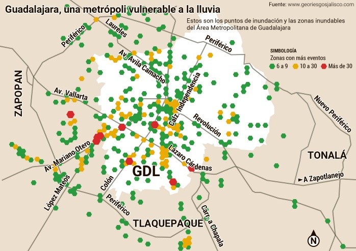 Las medidas implementadas por las autoridades para prevenir muertes por lluvias en este temporal han fracasado, con siete víctimas que fueron arrastradas por la corriente o fallecieron porque no pudieron salir de sus vehículos.Ni las obras realizadas por el SIAPA, ni la inversión en pantallas informativas en túneles incidieron en evitar los casos. Además, en 2020 el Instituto de Planeación y Gestión del Desarrollo del Área Metropolitana de Guadalajara (Imeplan) informó de un proyecto de alertas tempranas de inundaciones, que después cambió a un sistema de alerta multiamenaza, el cual no se ha implementado.Juan Guillermo Márquez, coordinador del Observatorio Ciudadano para la Gestión Integral del Agua, considera que las autoridades municipales y estatales han fallado, sobre todo por la urbanización descontrolada que se realiza en las partes altas de las cuencas. “Los principales responsables son los municipios porque otorgan las licencias, el SIAPA y la planeación estatal. Faltan medidas integrales”.Josué Daniel Sánchez Tapetillo, especialista en temas hídricos, remarca la necesidad de que exista un sistema de alerta temprana. “Las inundaciones son cada vez más graves y tendríamos que actuar en consecuencia, no se están tomando medidas a la par o en la misma velocidad que se generan los riesgos”. Especialistas en temas hídricos señalan que la ciudad ha crecido de una manera desordenada en partes altas de cuencas al no contemplar que las construcciones inciden en una menor infiltración de agua, que en consecuencia detonan un mayor escurrimiento a las partes bajas, lo que causa inundaciones más graves.Juan Guillermo Márquez, coordinador del Observatorio Ciudadano para la Gestión Integral del Agua, explica que el desnivel de Periférico y avenida Central Guillermo González Camarena, donde fallecieron dos personas, se encuentra en la cuenca de Atemajac. “No han sido lluvias tan intensas, pero vemos que siguen fraccionando y se rebasa la capacidad de los colectores construidos hace años. Si no se detiene la impermeabilización del suelo en esas zonas, cualquier lluvia moderada o intensa va a estar provocando lo que vimos, no es una cuestión fortuita. Es un tema de mala planeación urbana”.El especialista considera que es muy delicado que existan tantos puntos de inundación peligrosos en la ciudad sin que éstos sean resueltos. “No se puede construir aguas arriba sin que exista la capacidad de colectores, es una combinación de medidas que deben tomarse”.Josué Daniel Sánchez Tapetillo, especialista en temas hídricos, recuerda que el paso a desnivel de Periférico y avenida Central Guillermo González Camarena colinda con el arroyo de La Campana, el cual ha sido afectado por la urbanización en zonas arriba del Trompo Mágico.“El Arroyo de la Campana viaja desde avenida Aviación, cerca de la base aérea militar, donde está el fraccionamiento Valle Real, inicia en esa zona y pasa cerca del Trompo Mágico, corre paralelo a avenida Servidor Público, cruza Periférico, pasa por el bosque pedagógico del agua, el famoso Colomos III, y llega a avenida Patria, es parte del mismo sistema y cuenca”.Josué Daniel Sánchez Tapetillo propuso que con la implementación de un sistema de alerta temprana de inundaciones se pudiera llegar a poner plumas en los desniveles, las cuales bajaran automáticamente para evitar el paso de los automóviles.“Que midieran la intensidad de la lluvia, y los niveles que va registrando para cerrarse de manera automática con algunas plumas, para que la gente no ingrese, como el caso de la lluvia del jueves”.Incluso recuerda que en un fraccionamiento cercano a Centro Sur ponían plumas para evitar que la gente pasara cuando llovía y se inundaba. “Bajaban la pluma para que no pasaran los carros. En la ciudad ya hemos generado ese tipo de acciones”.También destaca que tras la inundación en una plaza de la zona hace algunos años, se previó instalar un sistema para monitorear la cuenca de Atemajac.Autoridades zapopanas afirmaron que la inundación del túnel de Servidor Público y Periférico, donde murieron dos personas este jueves, se derivó del desbordamiento de un canal en la zona de San Juan de Ocotán. Para el profesor Luis Valdivia Ornelas, investigador de la Universidad de Guadalajara y experto en el tema de inundaciones, la tragedia ocurriría eventualmente y pudo evitarse de frenarse la urbanización excesiva en la parte alta de dicha cuenca.El experto menciona tres elementos: primero, el túnel ya se conocía como zona de alto riesgo con seis eventos de inundación desde 2009; segundo, el canal que se desbordó es en realidad la cuenca del arroyo de La Campana, una de las más importantes del Poniente de la ciudad, y tercero, la urbanización en esa zona, por donde pasa La Campana, le restó capacidad de retención al arroyo y por eso se desbordó en la parte baja.“Obviamente el canal trae más agua debido a la impermeabilización de las superficies y, por lo tanto, es susceptible a desbordarse y desbordar más volumen de líquido en un periodo más corto de tiempo. Entonces, el problema es que hay infraestructura muy vulnerable como los pasos a desnivel. En este caso (el desnivel de avenida Central) es particularmente vulnerable porque hay un segmento de 40 metros o más del canal paralelo a la avenida y luego se convierte en el paso a desnivel”. El académico señaló que se hicieron algunas obras de poner muros de contención a los lados del canal para evitar se desborde: “pero son pequeños e insuficientes por el volumen que trae y el arrastre de la parte alta. Es lógico que, ante tormentas fuertes, pues el canal empieza a desbordar”, agregó.LA VOZ DEL EXPERTOJosé Luis Velázquez, titular de Protección Civil de la UdeG.El especialista recomienda a la población tomar decisiones con base en información actualizada de las unidades de Protección Civil o autoridades sobre los fenómenos m