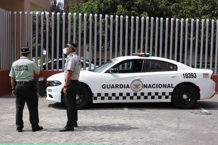 Elementos de la Guardia Nacional vigilan las instalaciones del Hospital Ángeles del Pedregal, donde se encuentra hospitalizado Emilio Lozoya. EFE / J. Pazos