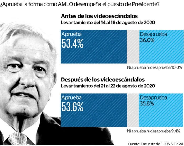 El Presidente de México, Andrés Manuel López Obrador, conserva una elevada aprobación del 53.6% a seis días de entregar al Congreso de la Unión el informe de su segundo año de Gobierno, marcado por la crisis sanitaria y económica, de acuerdo a una encuesta publicada este miércoles.Según el sondeo del periódico El Universal, el 35.8% de la población desaprueba al Mandatario del izquierdista Movimiento Regeneración Nacional (Morena), el 9.4 % ni lo aprueba ni lo desaprueba y el 1.2 % no lo sabe.Asimismo, más de la mitad de la población, el 52.4%, considera que ha demostrado en sus casi dos años de Gobierno capacidad para resolver los problemas del país, mientras que el 46.3% opina lo contrario y el 1.3% no lo sabe.El 48.6% aplaude la forma cómo el Mandatario está combatiendo la corrupción, su principal promesa electoral, mientras que el 44.9% lo desaprueba, el 5.2% no se posiciona y el 1.3% no lo sabe.El manejo de la relación con Estados Unidos tras el encuentro de López Obrador con Donald Trump el mes pasado en la Casa Blanca también recibe un sustancial apoyo del 47%, mientras que el 40.5% lo desaprueba, el 7.9% no se posiciona y el 4.6% no lo sabe.En cambio, la gestión de la crisis sanitaria de la COVID-19, que acumula 568 mil 621 contagios y 61 mil 450 defunciones en el país, solo recibe el apoyo del 41.2%, mientras que el 48.8% se opone, el 8.8% no se posiciona y el 1.2% no lo sabe.A pesar de la captura a principios de mes del líder del poderoso Cártel Santa Rosa de Lima, José Antonio Yépez, alias "El Marro", solo el 36.1% aprueba el combate de López Obrador al crimen organizado, el 57.1% lo desaprueba, el 5.6% no se posiciona y el 1.2% no lo sabe.Mientras que la gestión de la economía, que en el segundo trimestre sufrió una caída del 18.7% y la destrucción de un millón de empleos, tiene la aprobación del 34.3% y una desaprobación del 53.9%, mientras que el 7.4% no se posiciona y el 4.4% no los sabe.La encuesta fue realizada de forma telefónica a mil 300 personas entre el 14 y el 22 de agosto con un nivel de confianza del 95% y un margen de error del 3.5 por ciento.Como dicta la ley, López Obrador, Presidente desde diciembre de 2018, presentará el próximo 1 de septiembre su segundo informe de Gobierno ante el Congreso mexicano.El Mandatario, que arrasó en las elecciones con el 53 % de los votos, inició su mandato con una enorme popularidad cercana al 80%, la cual ha ido mermando por la violencia en el país y la pandemia, aunque todavía se sitúa en niveles altos de entre el 50 y el 60 por ciento.OA