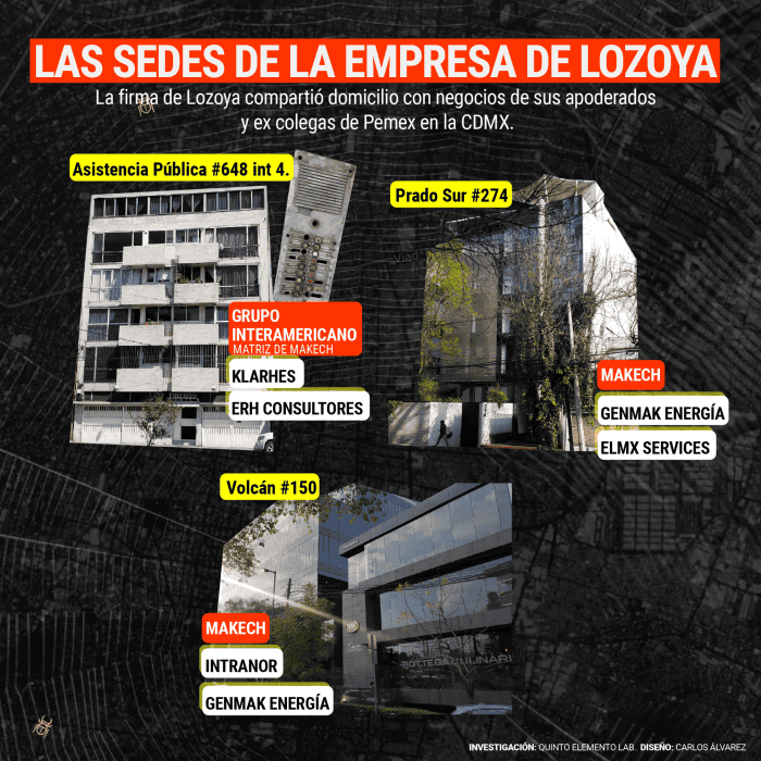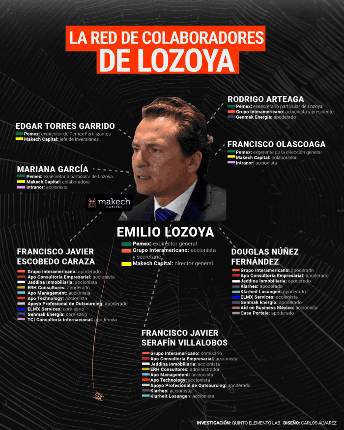 Cuando Emilio Lozoya Austin dejó la dirección general de Pemex, la compañía más grande de México, tardó apenas un mes en fundar una nueva empresa que dio origen a un fondo de inversión cuya operación es prácticamente desconocida por los jugadores más relevantes en México y que hoy está rodeada de un halo de misterio.Lozoya creó Makech Capital de la mano de Rodrigo Arteaga, su exsecretario particular en Pemex, y en ese fondo también coincidieron otros tres antiguos colegas de la petrolera: Édgar Torres Garrido, Francisco Olascoaga Rodríguez y Mariana García de la Cadena Salas. Una tríada de contadores y abogados también confluyeron en la fundación de la compañía que dio origen a Makech: Francisco Javier Escobedo Caraza, Francisco Javier Serafín Villalobos y Douglas Nuñez Fernández.Una investigación de Quinto Elemento Lab descubrió que este grupo de exfuncionarios y asesores no solo tienen en común haber participado en la firma de Lozoya, sino que varios de ellos contribuyeron al nacimiento de otras empresas que compartieron al menos tres domicilios con la empresa del exdirector de Pemex. Varias de esas personas y compañías ya están bajo investigación de la Unidad de Inteligencia Financiera (UIF).Lozoya, detenido este mes en España acusado de presunto cohecho, fraude y lavado de dinero, creó el 17 de marzo de 2016 la empresa Grupo Interamericano de Financiamiento para el Desarrollo y a través de esa compañía registró la marca Makech Capital el 7 de diciembre de ese mismo año.De acuerdo con documentos del registro público mercantil en la capital mexicana, Lozoya aportó 450 mil pesos para hacerse del 90% de las mil acciones clase A, y con ello se convirtió en el dueño mayoritario; Arteaga quedó como el accionista minoritario de la firma.Para registrar al Grupo Interamericano ambos dieron como domicilio el departamento 4 de un desgastado edificio en Asistencia Pública 648, una calle poblada de fondas y tiendas de abarrotes, muy cerca del aeropuerto internacional de la Ciudad de México.A los residentes les sorprendió escuchar que ahí se aloja la sede de la empresa de inversión propiedad del exdirector de Pemex, pues ellos viven en departamentos cuyas rentas no superan los 5 mil pesos al mes.El modesto edificio en Asistencia Pública contrasta con las dos sedes comerciales que durante los últimos tres años reportó Makech Capital, hasta antes de ‘esfumarse’ misteriosamente en enero pasado. Las direcciones mercantiles que tuvo el fondo estuvieron en Las Lomas de Chapultepec, una exclusiva zona de oficinas corporativas, restaurantes de autor y sedes diplomáticas.La primera de sus oficinas estuvo en una torre en Prado Sur 274 según informaban el perfil de Makech Capital en LinkedIn y las tarjetas de presentación de Lozoya, aunque luego el fondo se mudó a unas cuantas calles, a un edificio corporativo en Volcán 150.A esta dirección acudió en junio del año pasado la Policía Federal a corroborar el domicilio de Lozoya, según la orden de aprehensión contra el exdirector de Pemex a la que Quinto Elemento Lab tuvo acceso. Ya se había emitido la orden de captura contra Lozoya y la Interpol tenía una ficha roja para arrestrarlo.A finales de enero, poco antes de la captura de Lozoya en Málaga, el fondo Makech Capital desmontó las oficinas de Volcán, según informó el personal que trabaja en el edificio. Ni la página web http://www.makechcapital.com/es/inicio/ ni el perfil de Makech en LinkedIn ofrecen información acerca de sus directivos, sus clientes o su nueva sede.“Parece que Makech es la antítesis de un fondo de capital privado porque no promueve su estructura; (los fondos) tienen que ser muy públicos porque lo que más vende es su equipo,”, dijo una experta en fondos de inversión que pidió omitir su nombre.Más de una docena de expertos y jugadores relevantes en el sector de los fondos de capital e inversiones en México consultados por Quinto Elemento Lab meses antes del arresto de Lozoya dijeron desconocer las operaciones de Makech.“No tenemos ninguna referencia del señor Emilio Lozoya ni de su trayectoria o actividades como inversionista”, afirmó un portavoz de la Asociación Mexicana de Capital Privado (Amexcap).El director de la UIF, Santiago Nieto, informó que la posible participación de Makech Capital en los sobornos de la firma brasileña Odebrecht es una hipótesis que está siendo indagada por las autoridades. “Es una línea de investigación, pero todavía no lo hemos acreditado”, dijo en una entrevista concedida en abril pasado.Lozoya es investigado por haber provocado un grave daño patrimonial a Pemex al comprar a sobreprecio una fábrica obsoleta de fertilizantes que pertenecía a Altos Hornos de México (AHMSA), por la adquisición irregular de la planta Fertinal y por presuntamente haber recibido sobornos de la constructora Odebrecht.El misterio que rodea la operación de Makech, está acrecentado por el hecho de que otras 14 empresas orbitan alrededor del Grupo Interamericano de Financiamiento, ya sea porque compartieron las mismas direcciones o porque los excolaboradores de Pemex y sus asesores aparecen incesantemente en las actas constitutivas que les dieron vida.Para crear el Grupo Interamericano, Lozoya y Arteaga fueron auxiliados por dos contadores y un abogado: en el registro mercantil aparecen como apoderados Francisco Javier Escobedo Caraza y Douglas Nuñez Fernández, y como comisario Francisco Javier Serafín Villalobos.En el edificio de Asistencia Pública número 648 están dadas de alta Klarhes, dedicada a la digitalización de documentos, y ERH Consultores, que ofrece servicios de consultoría financiera y outsourcing.Klarhes tiene como apoderado a Douglas Núñez y como accionista a Serafín Villalobos, y en ERH aparece Serafín como administrador y Escobedo como apoderado. Klarhes y Grupo Interamericano están relacionadas con otra empresa de digitalización, TCI Consultorí