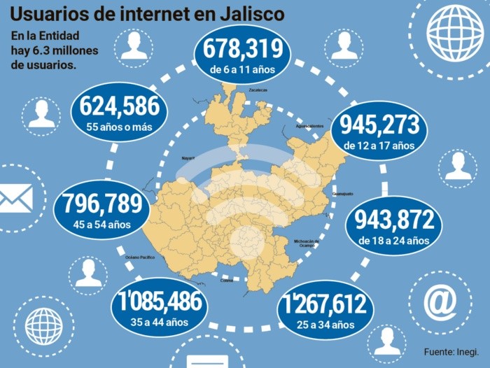 Desde hace 10 años, Karla maneja las redes sociales de una empresa de comunicación en Guadalajara, por lo que pasa alrededor de 12 horas diarias frente a la computadora. Mientras en 2017 el tiempo promedio de uso de internet en el país era de 3.2 horas al día, el año pasado subió a 4.8, de acuerdo con la Encuesta Nacional sobre Disponibilidad y Uso de Tecnologías de la Información en los Hogares (ENDUTIH) 2021, elaborada por el Instituto Nacional de Estadística y Geografía (Inegi). Arturo Blancas Espejo, director general de Estadísticas Económicas del Inegi, informó que los principales usos de internet documentados fueron para comunicarse, acceder a redes sociales y buscar información.En un año, los usuarios de internet aumentaron más de medio millón en Jalisco, al pasar de cinco millones 773 mil 347 personas en 2020 a seis millones 341 mil 937 al cierre del año pasado, según la Encuesta Nacional sobre Disponibilidad y Uso de Tecnologías de la Información en los Hogares (ENDUTIH) 2021. De ese total, los jaliscienses de 25 a 34 años son quienes utilizan más este recurso.“Los resultados de la encuesta nos muestran un panorama prometedor y optimista de hacia dónde va el país con el uso de las TIC (Tecnologías de la Información y la Comunicación). Vemos que cada año se incrementan los usuarios de internet”, destaca Gabriela Gutiérrez, directora general adjunta de Estadística y Análisis de Indicadores del Instituto Federal de Telecomunicaciones (IFT).Gutiérrez agrega que también hay una mayor utilización de internet para capacitación, evaluación “y también se ha incrementado su uso para hacer compras, pagos y operaciones bancarias en línea”.La funcionaria reconoce que aunque se ha reducido la población que no usa el internet porque no sabe hacerlo, persiste la brecha de habilidades digitales.Dice que ésta última disminuye un poco dependiendo el grupo de población y de la zona geográfica analizada. “Por ejemplo, la población de adultos mayores. Si bien el porcentaje de población de adultos mayores que usa el internet se ha incrementado, sigue existiendo una diferencia considerable con respecto de los otros grupos de edad. La principal razón es la falta de habilidades para usar el internet”, afirma.En el caso de Jalisco, la población de 55 años y más que usa el internet pasó de 612 mil 669 en 2020, a 624 mil 586 durante el año pasado. Gutiérrez agrega que los resultados de la encuesta arrojaron que también existe una brecha importante entre la población rural y urbana. “En ambas zonas, el principal problema es la falta de habilidades, pero en las zonas rurales se suma como segundo problema la falta de recursos económicos”.La directora recuerda que también existe la brecha de sexo, pues la proporción de hombres que usa el internet es mayor que el de las mujeres. “Lo que nos invita a profundizar, pues ¿Qué está pasando? ¿Por qué se mantiene esta brecha de dos puntos porcentuales?”.De las 88.6 millones de personas usuarias de internet que hay en el país (con corte a 2021) el 89.2% se conecta todos los días de la semana. Con respecto a 2017, se observó un crecimiento de 8.1 puntos porcentuales en quienes se conectaron diario, de acuerdo con la ENDUTIH.El 81.6% de la población usuaria de internet de seis años o más se concentró en la zona urbana y 56.5% en la rural.Los principales usos de internet fueron para comunicarse, buscar información y acceder a redes sociales. La interacción con el gobierno por internet aumentó, mientras que la actividad para buscar información disminuyó.Las Entidades federativas con mayor porcentaje de población usuaria de internet fueron: Ciudad de México, Baja California y Sonora. Los Estados que registraron los menores porcentajes fueron: Chiapas, Oaxaca y Guerrero. Jalisco se ubicó en el octavo lugar a nivel nacional, con 82.2 por ciento.Mientras que las Entidades con mayor porcentaje de hogares con internet fueron: Sonora, Ciudad de México y Baja California. Los Estados con porcentajes más bajos fueron: Chiapas, Oaxaca y Veracruz. Jalisco se ubicó en el lugar 13.En Corea del Sur, Reino Unido, Suecia, España, Estados Unidos y Japón, nueve de cada 10 personas son usuarias de internet. En México, la proporción es siete de cada 10 personas, cifra mayor a la registrada en Colombia y Sudáfrica.La ENDUTIH 2021 arroja que en el país existen diferencias significativas en el uso de las Tecnologías de la Información y la Comunicación (TIC) a nivel regional, siendo los Estados del Norte los más avanzados, mientras que los del Sur son los más rezagados.En la encuesta, dice, se reporta que durante el año pasado hubo una mayor contratación de paquetes de servicios que incluían internet, lo cual es consistente con los análisis realizados por el Instituto Federal de Telecomunicaciones (IFT).Estos reportaron también que hubo una migración hacia paquetes con mayor velocidad de internet. “Observamos que esto no fue homogéneo, sino que se concentró en algunas Entidades, como la Ciudad de México, Nuevo León y Baja California, que además se encuentran entre los Estados con mayor porcentaje de hogares con internet”.En contraste, agrega, Entidades del Sur como Oaxaca, Chiapas y Veracruz tienen el menor porcentaje de hogares con acceso a este servicio.“De nuevo, son Estados donde predominan los problemas de habilidades, de ingresos, donde los usos de internet para actividades como compras, ventas y operaciones bancarias tienen una baja incidencia”.En este sentido, subraya que es necesario impulsar no sólo la alfabetización digital sino también la inversión en infraestructura y mejores tecnologías.De acuerdo con la Encuesta Nacional sobre Disponibilidad y Uso de Tecnologías de la Información en los Hogares (ENDUTIH) 2021, durante el año pasado había 88.6 millones de personas usuarias de internet, lo que representó 75.6% de la población de seis años o más