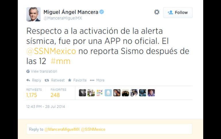 México | El jefe de gobierno capitalino escribe en Twitter que la alerta sísmica no es oficial Alerta sísmica se activó en aplicación no oficial: Mancera El jefe de gobierno capitalino escribe en su cuenta de Twitter que dicha alerta sísmica no proviene de una aplicación oficial Por: SUN 28 de julio de 2014 - 12:53 hs El tuit que emite el jefe de gobierno capitalino, Miguel Ángel Mancera. Foto:@ManceraMiguelMX. ESPECIAL / CIUDAD DE MÉXICO (28/JUL/2014).- El jefe de gobierno capitalino, Miguel Ángel Mancera, escribió en su cuenta de Twitter que la alerta sísmica que se activó en dispositivos móviles es de una aplicación no oficial. "Respecto a la activación de la alerta sísmica, fue por una APP no oficial. El @SSNMexico no reporta Sismo después de las 12 #mm". Lo anterior lo comentó luego de que el sistema de alerta privada SkyAlert lanzará un mensaje en su cuenta de twitter y en dispositivos móviles. "Alerta sísmica. Prepárese para un sismo en los próximos segundos. #SkyAlert Activo. 28 Jul14 12:16:40". Por su parte, el Sistema Nacional de Protección Civil descartó que el Sismológico y el Sistema de Alerta Sísmica hayan registrado sismo hoy a las 12:16 hrs. Temas Gobierno de México Sismos nacional Temblor Sismos Miguel Ángel Mancera Lee También Astros de Jalisco desafía al vigente campeón en la final de zona de la LNBP Buen Fin 2025: Consejos para hacer compras inteligentes ESTAS localidades de Jalisco presentaron actividad sísmica en las últimas horas ¿Quién es la diputada que se opone al impuesto de videojuegos violentos? Recibe las últimas noticias en tu e-mail Todo lo que necesitas saber para comenzar tu día Registrarse implica aceptar los Términos y Condiciones
