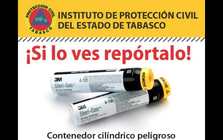 VILLAHERMOSA, TABASCO (01/SEP/2016).- El Instituto de Protección Civil de Tabasco lanzó la alerta para localizar un cilindro que contiene material peligroso, el cual fue sustraído de una camioneta en el estacionamiento de una plaza comercial la noche del pasado miércoles.En conferencia de prensa, Jorge Adalberto Méndez Landero, director Operativo de Protección Civil, dijo que fueron informados de la pérdida de un contenedor tipo cilíndrico que contiene material peligroso: “no es material radiactivo, es un material que se llama Steri-Gas, viene en un cilindro negro con amarillo el cual si trata de ser manipulado puede generar problemas severos en la salud”, explicó.Méndez Landero dijo que es importante en estos momentos la colaboración de los ciudadanos para localizar este cilindro, reiterando que cualquier intento para manipularlo podría ser peligroso.“Pedimos a toda la sociedad que eviten tratar de manipularlo, este producto no genera ningún tipo de explosión ni tiene ningún tipo de radiación, sin embargo, si se trata de manipular y se somete a altas temperaturas puede reaccionar de una manera totalmente diferente, por eso solicitamos la colaboración de toda la sociedad”, indicó.