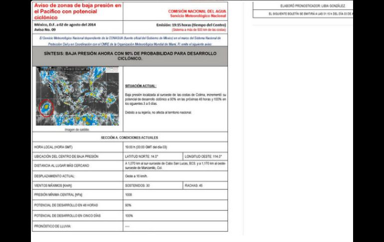 México | Protección Civil pide a la población de la región tener precaución ante lluvias fuertes Alertan sobre baja presión que evolucionaría a ciclón tropical en BCS Protección Civil pide a la población tener precaución ante lluvias fuertes y tormentas eléctricas Por: NTX 3 de agosto de 2014 - 11:55 hs El Sistema Nacional de Protección Civil mantiene este fenómeno en observación. Foto: @conagua_clima. ESPECIAL / CIUDAD DE MÉXICO (03/AGO/2014).- La baja presión que se ubica aproximadamente a mil 70 kilómetros al sur-suroeste de Cabo San Lucas, Baja California Sur tiene 90 por ciento de evolucionar a ciclón tropical en las próximas 48 horas. Ante dicha situación el Sistema Nacional de Protección Civil (Sinaproc), organismo dependiente de la Secretaría de Gobernación detalló que mantiene en observación a este fenómeno. Indicó, en su más reciente reporte, que aunque la baja presión no afecta tierras mexicanas pide a la población tener precaución ante la presencia de lluvias fuertes, chubascos y tormentas eléctricas, además de oleaje elevado en inmediaciones del sistema. Asimismo llamó a la población a tener precaución a la navegación marítima frente a costas del Pacífico Central, así como atender indicaciones de Protección Civil y estar al pendiente de los boletines del Sinaproc. Temas Segob Conagua Estados Clima Baja California Sur SMN Lee También Trump amenaza con "incremento masivo" de aranceles a China Antes de irse, "Priscilla" dejará lluvia en esta zona de México Tormenta "Raymond" llevará lluvia a Puerto Vallarta "Raymond", "Priscilla" y otros fenómenos dejarán lluvias en estos estados Recibe las últimas noticias en tu e-mail Todo lo que necesitas saber para comenzar tu día Registrarse implica aceptar los Términos y Condiciones