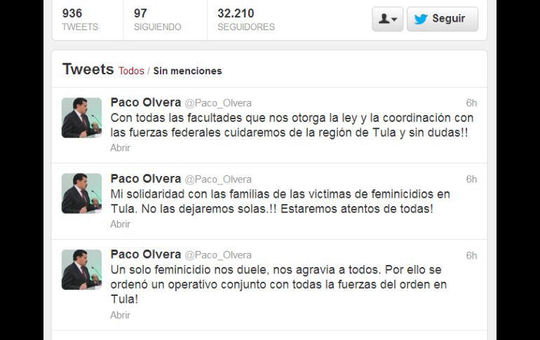 México | El gobernador de Hidalgo expresó su solidaridad con las familias de las víctimas Anuncian operativo conjunto por feminicidios en Tula Olvera Ruiz expresó su solidaridad con las familias de las víctimas Por: NTX 26 de enero de 2013 - 21:13 hs El gobernador de Hidalgo, Francisco Olvera, dio a conocer la noticia a través de Twitter. TOMADA DE @Paco_Olvera / PACHUCA, HIDALGO (26/ENE/2013).- El gobernador de Hidalgo, Francisco Olvera Ruiz, informó que se aplicará un operativo en coordinación de fuerzas federales, luego de los casos de feminicidios registrados en la región de Tula. En su cuenta oficial de Twitter, @Paco_Olvera, el mandatario estatal señaló: "Un solo feminicidio nos duele, nos agravia a todos. Por ello se ordenó un operativo conjunto con todas la fuerzas del orden en Tula". Olvera Ruiz expresó su solidaridad con las familias de las víctimas y recalcó que "con todas las facultades que nos otorga la ley, cuidaremos de la región de Tula". Temas Hidalgo Violencia contra las mujeres Estados Feminicidios Twitter Lee También Que siempre no: el Villarreal vs Barcelona no se jugará en EU Asesinan a maestra en Oaxaca presuntamente por una calificación Llega "Melissa" al Atlántico; esta es la trayectoria de la tormenta A punto de aparecer el ciclón "Melissa"; a esta distancia está de México Recibe las últimas noticias en tu e-mail Todo lo que necesitas saber para comenzar tu día Registrarse implica aceptar los Términos y Condiciones