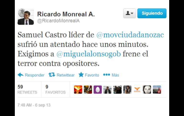 México | Samuel Castro Correa ya es atendido en un hospital privado Apuñalan a líder de Movimiento Ciudadano en Zacatecas Samuel Castro Correa ya es atendido en un hospital privado donde es reportado como estable Por: SUN 6 de septiembre de 2013 - 17:06 hs Ricardo Monreal exige justicia a través de Twitter por el atentado contra Samuel Castro. TOMADA DE @RicardoMonrealA / ZACATECAS, ZACATECAS (06/SEP/2013).- Samuel Castro Correa, dirigente estatal del partido político Movimiento Ciudadano, fue apuñalado al salir de su domicilio, por lo que el gobierno estatal condenó el hecho. En un comunicado, las autoridades estatales informaron que el ataque ocurrió este viernes por la mañana cuando un hombre hirió al líder partidista en su casa, ubicada en la colonia Sierra de Álica, en la capital zacatecana. Precisó que la víctima fue herida en la cara lateral derecha del abdomen por un arma punzo cortante y es atendida en un hospital privado, donde los médicos lo reportan como estable. Añadió que hasta el momento no se ha realizado la denuncia correspondiente; sin embargo, aclaró que personal de la Procuraduría General de Justicia del Estado se encuentra en el hospital junto con la familia del afectado. En tanto, el diputado federal Ricardo Monreal Ávila, en su cuenta de Twitter lamentó el hecho y escribió: Samuel Castro líder de @movciudadanozac sufrió un atentado hace unos minutos. Exigimos a @miguelalonsogob frene el terror contra opositores." "Mi solidaridad con Samuel Castro y su fam, luchar contra la corrupción y el pillaje del Gobierno de Zacatecas, es una tarea encomiable", añadió. Temas Estados Zacatecas Agresiones contra políticos Movimiento Ciudadano Lee También Cartucho Mundial Sub-20: EU golea a Italia y enfrentará a Marruecos ALERTA en Jalisco por formación de ciclón "Raymond" Esta es la última guerra que Trump resolvió, según él mismo Recibe las últimas noticias en tu e-mail Todo lo que necesitas saber para comenzar tu día Registrarse implica aceptar los Términos y Condiciones