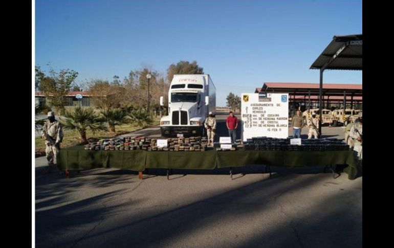 México | Soldados detienen a dos presuntos narcotraficantes en Sonora Aseguran droga con valor de 825 MDP El cargamento incluía 282 kilos de cocaína, 147 de 'crystal' y 21.45 kilos de heroína Por: EL INFORMADOR 16 de febrero de 2011 - 20:59 hs La droga se hallaba en un camión que llevaba mercancía de abarrotes. EFE / CIUDAD DE MÉXICO (16/FEB/2011).- Soldados del Ejército Mexicano aseguraron en San Luis Rio Colorado, Sonora, drogas diversas con valor superior a los 825 millones de pesos y detuvieron a dos presuntos narcotraficantes. En un comunicado, la Secretaría de la Defensa Nacional (Sedena) dio a conocer que en el puesto de control conocido como Cucapah, en el kilómetro 176 de la carretera Sonoyta-San Luis Rió Colorado, los soldados revisaron un camión que llevaba mercancía de abarrotes, y oculto entre las cajas encontraron un cargamento de droga. El personal de la 45 Zona Militar detectó entre la mercancía del camión 282 kilos de cocaína, 147 de la droga sintética conocida como 'crystal' y 21 kilos 450 gramos de heroína. De acuerdo con los cálculos de la Sedena, ese cargamento habría sido suficiente para elaborar casi 857 millones de dosis de cocaína, cuatro millones 603 mil 125 dosis de 'crystal' y 429 mil dosis de heroína, todas ellas con valor comercial en el mercado negro de 825 millones 750 mil 443 pesos. La Defensa informó que de esta manera se afecta severamente a la finanzas de las organizaciones del crimen organizado, ya que tenían el objetivo de llevar esas drogas al mercado negro de los Estados Unidos. Localizan una tonelada de mariguana entre bolsas de jabón Por otra parte, elementos de la Policía Federal aseguraron más de una tonelada de mariguana, que estaba oculta en un tráiler, entre bolsas de detergente en polvo, en el municipio de Sonoyta, Sonora, informó la Secretaría de Seguridad Pública (SSP) federal. A través de un comunicado, la dependencia detalló que los efectivos federales localizaron, mediante revisiones aleatorias, un tractocamión que transportaba 235 paquetes de la droga entre bolsas de jabón en polvo. Los agentes le marcaron el alto a la unidad para realizar una revisión de rutina, tras lo cual tuvieron contacto con el chofer, quien se identificó como José Merced Hernández Flores, de 48 años de edad. El operador de la unidad aseveró que la carga sería entregada a un supermercado de la zona. Fue asegurado el tráiler Volvo blanco con franjas azules y ribetes rojos, placas de circulación 324AL6, acoplado a un semirremolque blanco tipo caja, marca Utility, matrícula 817UF7 del Servicio Público Federal. El conductor del camión y la droga quedaron a disposición del Agente del Ministerio Público de la Federación en la entidad. Con información de El Universal y NTX Temas Narcotráfico Crimen Organizado Ejército Sonora Lee También Napoleón une su voz con La Sonora Dinamita en una colaboración inédita ¿Qué representa el amparo de Bermúdez Requena para la FGR? Israel intercepta otra flotilla rumbo a Gaza y detiene a activistas Falta muchísimo, pero vamos bien Recibe las últimas noticias en tu e-mail Todo lo que necesitas saber para comenzar tu día Registrarse implica aceptar los Términos y Condiciones