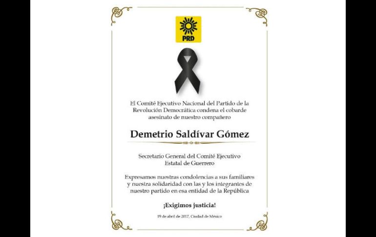 CIUDAD DE MÉXICO (20/ABR/2017).- La Fiscalía General del Estado de Guerrero (FGE) informó que al secretario general del PRD en Guerrero, Demetrio Saldívar Gómez, lo asesinaron dos hombres que después del crimen huyeron hacia el municipio de Tixtla.Por este asesinato, el gobernador Héctor Astudillo Flores, canceló su gira de trabajo por Miami, Estados Unidos, donde se reuniría con empresas navieras para tratar de que regresen a los puertos guerrerenses los cruceros que por la inseguridad han cancelado su arribo.De acuerdo con la FGE, alrededor de las 09:30 de la noche, dos hombres a bordo de un auto Tsuru le cerraron el paso al dirigente y le dispararon en diferentes ocasiones. En el lugar se encontraron nueve casquillos percutidos calibre .9 milímetros.La FGE integró una carpeta de investigación por homicidio calificado; la averiguación sobre el asesinato del dirigente la encabezará el fiscal, Xavier Olea Peláez. La FGE no informó sobre las líneas de investigación.En tanto, el gobernador anunció a través de su cuenta de Twitter, la cancelación de su gira de trabajo en los Estados Unidos.“Repruebo y lamento el asesinato de Demetrio Saldívar. He solicitado con urgencia una investigación a la @FGEGuerrero", escribió Astudillo Flores."Estos lamentables acontecimientos obligan a que cancele la gira de trabajo programada y regrese lo antes posible al estado”, anunció el mandatario.
