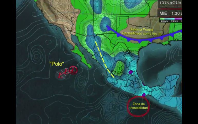 México | La Conagua informa sobre inestabilidad al sur del Golfo de Tehuantepec Aumenta potencial ciclónico en el Pacífico La Conagua informa que la zona de inestabilidad ubicada al sur del Golfo de Tehuantepec aumentó a 70% su potencial de desarrollo ciclónico Por: SUN 22 de septiembre de 2014 - 14:17 hs CIUDAD DE MÉXICO (22/SEP/2014).- La Comisión Nacional del Agua ( Conagua) informó que la zona de inestabilidad ubicada al sur del Golfo de Tehuantepec aumentó a 70% su potencial de desarrollo ciclónico en el pronóstico a 48 horas. En un alertamiento meteorológico, indicó que dicho fenómeno meteorológico se localiza a 520 kilómetros al sur de Puerto Ángel, Oaxaca; tiene vientos máximos sostenidos de 35 km/h, rachas de hasta 45 km/h y desplazamiento hacia el oeste-noroeste a 16 km/h. El organismo indicó que mantiene estrecha vigilancia del sistema debido a su cercanía a costas nacionales y su probable evolución. Dicha zona de inestabilidad favorecerá lluvias muy fuertes en sitios de Oaxaca y Guerrero, y fuertes en Michoacán, agregó la Conagua. Asimismo, informó que Polo se convirtió en baja presión remanente y que se ubica aproximadamente a 470 km al oeste de Cabo San Lucas, en Baja California Sur, con vientos máximos sostenidos de 45 km/hr, rachas de hasta 65 km/hr y movimiento hacia el oeste-suroeste a 11 km/hr. Aunque sus efectos son menores, aún origina lluvias en la costa occidental de Baja California Sur. Además, alertó que un canal de baja presión que se extiende en el sureste y oriente del país, propiciará lluvias intensas en Chiapas, muy fuertes en Veracruz, y fuertes en Tabasco. Por otra parte, el frente frío número 3 se localiza en el noreste de México, por lo que se prevén precipitaciones intensas en Tamaulipas, y fuertes con tormentas en áreas de Nuevo León y Coahuila. Agregó que otro fenómeno meteorológico, la onda tropical 31, se localiza en el occidente del Mar Caribe, y en las próximas horas se ubicará en la Península de Yucatán; ocasionará tormentas y lluvias fuertes en Yucatán, Campeche y Quintana Roo. En Chihuahua se prevén lluvias muy fuertes; en Querétaro, San Luis Potosí, Jalisco, Zacatecas, Hidalgo, Morelos, Tlaxcala, Puebla, Estado de México y el Distrito Federal se pronostican tormentas y lluvias fuertes, y en Sonora, Sinaloa, Durango, Nayarit, Aguascalientes, Colima y Guanajuato, se esperan lluvias de menor intensidad, debido a una zona de inestabilidad sobre el noroeste, norte, occidente y algunas regiones del centro del territorio, así como al aire húmedo procedente del Golfo de México y el Océano Pacífico. Temas Conagua Estados Ciclones Clima Lee También ¿Por qué duelen las manos cuando hace frío? "Raymond" baja su potencia, pero tocará tierra en horas En Hidalgo, caminos destrozados complican rescates y ayuda Así estará Guadalajara por la tarde; ¿lloverá? Recibe las últimas noticias en tu e-mail Todo lo que necesitas saber para comenzar tu día Registrarse implica aceptar los Términos y Condiciones