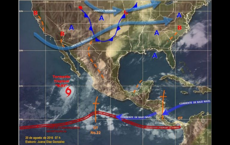 CIUDAD DE MÉXICO (20/AGO/2016).- El Sistema Nacional de Protección Civil (Sinaproc) activó la alerta azul en fase de acercamiento para Baja California Sur ante la presencia de la tormenta tropical Kay, que se desplaza lentamente hacia el noroeste.Mediante su Sistema de Alerta Temprana (Siat), informó que la alerta verde en la Isla Socorro, Colima disminuyó a fase de alejamiento.A las 10:00 horas, Kay se ubicaba a 230 kilómetros al noroeste de Isla Socorro, Colima, y a 410 kilómetros al suroeste de Cabo San Lucas, Baja California Sur.En su alerta por ciclón tropical, abundó que el fenómeno climático se desplaza hacia el noroeste, a una velocidad de nueve kilómetros por hora, con vientos sostenidos de 85 kilómetros por hora y rachas de 100 kilómetros por hora. Se prevé que este sistema continúe su desplazamiento paralelo a la costa oeste de la Península de Baja California sin probabilidad de impacto, pero a su paso ocasionará lluvias, viento fuerte y oleaje elevado. Además sus bandas nubosas exteriores aumentarán en el potencial de lluvias en Baja California Sur e Isla Socorro y en el occidente del país.