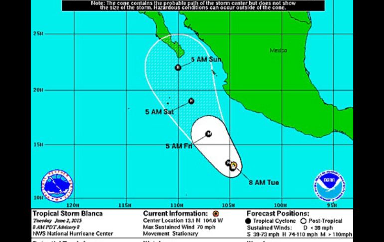 México | Se espera que se convierta en huracán este martes en el suroeste del Pacífico Baja California está en la trayectoria de la tormenta 'Blanca' Se espera que se convierta en huracán este martes en el suroeste del Pacífico Por: NTX 2 de junio de 2015 - 10:12 hs MIAMI, ESTADOS UNIDOS (02/JUN/2015).- La tormenta 'Blanca' se espera que se convierta en huracán hoy en el suroeste del Pacífico y los pronósticos de largo plazo indican que se dirige a Baja California, México, según el Centro Nacional de Huracanes (CNH) de Estados Unidos. A las 15:00 horas GMT el centro de 'Blanca' se ubicaba a 605 kilómetros al sur-suroeste de Zihuatanejo, o a 655 kilómetros al sur de Manzanillo. 'Blanca' tiene vientos máximos sostenidos de 110 kilómetros por hora, y se espera que se fortalezca rápidamente y se convierta en huracán esta tarde y llegue a categoría tres o mayor el miércoles, según el CNH. Los pronósticos de computadora de largo plazo del CNH ponen el cono de la trayectoria de 'Blanca' rumbo a la mexicana Península de Baja California para el domingo. Más al norte del Pacífico, 'Andrés' que llegó a ser un poderoso huracán categoría cuatro, sigue debilitándose y tiene vientos de 150 kilómetros por hora. El centro de 'Andrés' se ubica lejos a mil 465 kilómetros al oeste de Baja California y aunque no es una amenaza de impacto para tierra firme, el oleaje esta afectando la costa oeste de Baja California. Se espera mayor debilitamiento y que se degrade a tormenta tropical el miércoles. Temas Estados Huracanes Clima Tormenta tropical Baja California Lee También Suspenden clases en estos 9 municipios de Jalisco ante el paso de tormenta tropical 'Raymond' Viernes de tormentas en Guadalajara; aparecerán a esta hora LLUVIA en GDL por la noche, pronóstico del clima para hoy, 9 de octubre Tormenta tropical "Raymond" mantiene en alerta a estos estados el fin de semana Recibe las últimas noticias en tu e-mail Todo lo que necesitas saber para comenzar tu día Registrarse implica aceptar los Términos y Condiciones