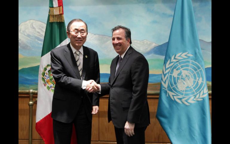 México | Participará en la primera reunión sobre Alianzas Globales para Cooperación y Desarrollo Ban Ki-moon se reúne en privado con José Antonio Meade El secretario general de la ONU participará en la primera reunión sobre Alianzas Globales para Cooperación y Desarrollo Por: SUN 14 de abril de 2014 - 18:26 hs Ban Ki-moon es recibido por José Antonio Meade. TOMADA DE @SRE_mx / CIUDAD DE MÉXICO (14/ABR/2014).- El secretario general de la Organización de Naciones unidas ( ONU), Ban Ki-moon, se reunió este lunes en privado con el titular de la Secretaría de Relaciones Exteriores de México, José Antonio Meade. Ban Ki-moon inició una visita de dos días a México. El canciller mexicano le dio la bienvenida al país. Participará en la primera reunión de Alto Nivel sobre Alianzas Globales para Cooperación y Desarrollo. Antes, cancilleres de México, Australia, Turquía, Indonesia y Corea coincidieron en la pertinencia de mantener el espacio informal de diálogo conformado por esos cinco países. Acordaron además realizar por lo menos tres reuniones anuales para analizar temas internacionales. Temas SRE Política Ban Ki-moon José Antonio Meade Lee También Periodista denuncia ataque armado durante "La Mañanera" La aparente estabilidad mexicana La embriaguez del poder: cuando el alma se emborracha de sí misma Ni tan buenos ni tan malos Recibe las últimas noticias en tu e-mail Todo lo que necesitas saber para comenzar tu día Registrarse implica aceptar los Términos y Condiciones