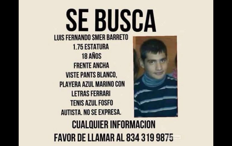 México | Luis Fernando Smer Barreto se encuentra desaparecido desde hace dos días Buscan a joven autista extraviado en sierra de Tamaulipas Luis Fernando Smer Barreto, de 18 años, se encuentra desaparecido desde hace dos días Por: SUN 25 de enero de 2016 - 09:10 hs La desaparición fue reportada el sábado a las 19:00 horas, a la altura del paraje conocido como Los Troncones, en Ciudad Victoria. ESPECIAL / twitter.com CIUDAD VICTORIA, TAMAULIPAS (25/ENE/2016).- El joven Luis Fernando Smer Barreto, quien padece de autismo, pasó su segunda noche desaparecido, mientras que elementos de Protección Civil, del Ejército, de Fuerza Tamaulipas Montada, y grupos de voluntarios, entre cabalgantes y de clubes 4 x 4 "peinan" la Sierra Madre en su búsqueda. La Coordinación Estatal de Protección Civil informó que la desaparición del joven de 18 años de edad fue reportada el sábado a las 19:00 horas, a la altura del paraje conocido como Los Troncones, en el municipio de Ciudad Victoria. Al momento que se extravió, Luis Fernando vestía pants blanco, playera azul marino y tenis azul fosforescente. Marco Bladimir Carrizales, de 23 años de edad, fue quien acompañaba a Luis Fernando y reportó su desaparición. La intensa búsqueda inició desde la noche del sábado y durante el domingo se unieron grupos de ciudadanos, cabalgantes y de clubes 4 x 4. La señora Maribel Barreto, mamá de Luis Fernando, pidió la ayuda de las instituciones y de las personas para encontrar a su hijo. "Estamos desesperados, es muy peligroso porque el niño sufre, está en condición de autismo, él no sabe expresarse", mencionó. Además de lo extenso del lugar donde se realizan las acciones de búsqueda, Maribel Barreto se refirió al temor por las condiciones climáticas, "tenemos miedo de una hipotermia, porque por la noche la temperatura desciende mucho", comentó. Temas Estados Tamaulipas Niños Autismo Lee También ALERTA en Jalisco por formación de ciclón "Raymond" Esta es la última guerra que Trump resolvió, según él mismo Las guerras que Trump dice haber resuelto y por las que merece el Nobel ¿Cuándo la tormenta tropical "Raymond" estará cerca de Jalisco? Recibe las últimas noticias en tu e-mail Todo lo que necesitas saber para comenzar tu día Registrarse implica aceptar los Términos y Condiciones