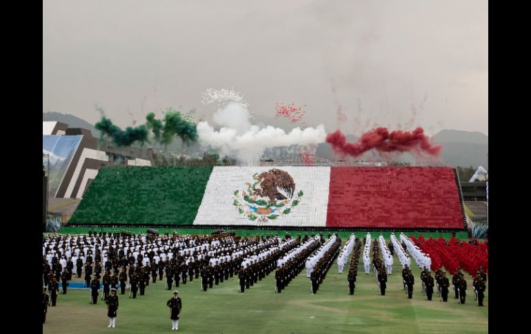 México | Celebra el 165 aniversario de la gesta heroica del 13 de Septiembre Calderón encabeza ceremonia en el Colegio Militar Bajo el titulo ''Pensamientos de la Patria'' las fuerzas armadas presentaron un espectáculo montado en la plaza de maniobras del Heroico Colegio Militar Por: SUN 13 de septiembre de 2012 - 14:22 hs CIUDAD DE MÉXICO (13/SEP/2012).- El Presidente Felipe Calderón encabezó este jueves en el Heroico Colegio Militar el evento magno con el que se celebra el 165 aniversario de la gesta heroica del 13 de Septiembre y con el que además las fuerzas armadas se despiden del mandatario mexicano. Tras arribar acompañado del general Guillermo Galván, secretario de la Defensa Nacional y del almirante Francisco Mariano Saynez, de la Marina, el Presidente Felipe Calderón ocupó el balcón principal del edificio de gobierno del heroico Colegio Militar. En el evento que inició con el protocolario saludo al Mandatario y la presentación de las banderas de las representaciones diplomáticas de los 15 países que asisten los cuales son Alemania, Brasil, Canadá, Chile, Cuba, Colombia, Italia, Estados Unidos, Ecuador, El Salvador, Guatemala, Honduras, Nicaragua, Uruguay y Perú, se desarrolló la tarde de este jueves con la presentación de la etapa prehispánica de México. Bajo el título "Pensamientos de la Patria" las fuerzas armadas presentaron un espectáculo montado en la plaza de maniobras del Heroico Colegio Militar, en el cual se sucedieron las etapas emblemáticas de la historia de México, en tanto los narradores dieron pie a una serie de poemas, referencias y música relacionada con la etapa que se presentaba. El monumental evento que duplica en equipo, aeronaves, vehículos y personal al que presentaron las fuerzas armadas el año pasado, integró imágenes gigantes de edificios históricos sobre las paredes principales de la plaza de maniobras del Heroico Colegio Militar. Temas Gobierno de México Felipe Calderón Ejército Lee También Fallece influencer Fede Dorcaz en presunto intento de robo en la CDMX Autoridades despliegan elementos para apoyar a la población afectada por las lluvias Lista actualizada de selecciones que ya clasificaron al Mundial 2026 La edad de riesgo de padecer un trastorno mental, según expertos Recibe las últimas noticias en tu e-mail Todo lo que necesitas saber para comenzar tu día Registrarse implica aceptar los Términos y Condiciones