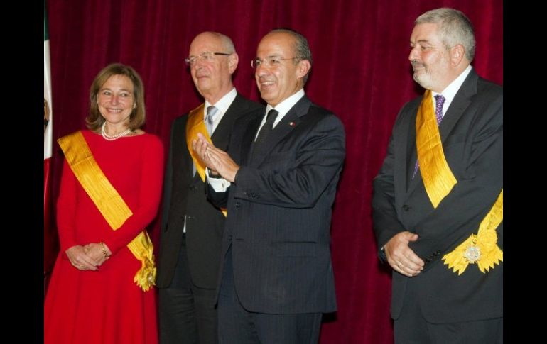 México | Condecora a Susan Segal, Klaus Schwab y Magdy Martínez Solimán Calderón impone Orden del Águila Azteca a extranjeros El Mandatario hizo un reconocimiento a la labor desarrollada por los tres galardonados en beneficio de la humanidad Por: NTX 25 de septiembre de 2012 - 16:52 hs NUEVA YORK, ESTADOS UNIDOS (25/SEP/2012).- El presidente de México, Felipe Calderón Hinojosa impuso hoy la Orden Mexicana del Águila Azteca a tres personalidades del mundo que, dijo, han hecho una labor de gran trascendencia para el país. El mandatario entregó el galardón, en Grado de Banda a Susan Segal, presidenta y directora Ejecutiva del Consejo de las Américas; al Fundador del Foro Económico Mundial de Davos, Klaus Schwab, así como a Magdy Martínez Solimán, quien fue coordinador del Sistema de las Naciones Unidas en México. En el salón Drawing del exclusivo hotel New York Palace, acompañado por su esposa Margarita Zavala, el titular del Ejecutivo Federal hizo un reconocimiento a la labor desarrollada por los tres galardonados en beneficio de la humanidad, y en especial de México. Indicó que la Orden Mexicana del Águila Azteca es el máximo galardón que entrega el gobierno de México a ciudadanos que han hecho en nuestra nación una labor de gran trascendencia. El mandatario subrayó que en lo personal le representa un honor entregar la condecoración como presidente de México y representante de una nación fiel a sus ideales y convicciones democráticas. Puntualizó que los tres galardonados son ciudadanos del mundo, comprometidos con las mejores causas de la humanidad, y la Orden Mexicana a la que se hicieron acreedores representa un símbolo de amistad, reconocimiento y agradecimiento, porque han dejado huella con sus acciones en beneficio del país. Temas Felipe Calderón Estados Unidos Giras presidenciales Lee También La paz siempre es una buena noticia Revelan llamada al 911 con que se reportó la muerte de Diane Keaton SMN advierte lluvias y bajas temperaturas en México esta semana Organismo internacional prevé tensión comercial a nivel global en 2026 Recibe las últimas noticias en tu e-mail Todo lo que necesitas saber para comenzar tu día Registrarse implica aceptar los Términos y Condiciones