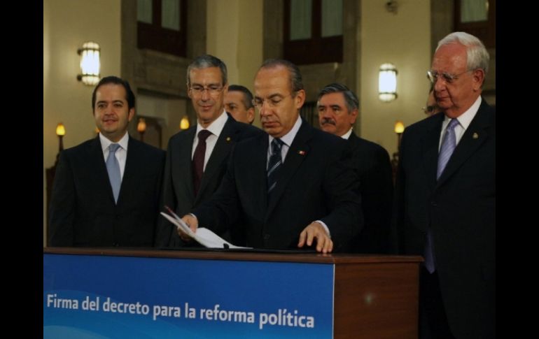 México | El Mandatario reconoció la labor de los legisladores para aprobar las modficaciones Calderón promulga la Reforma Política El Presidente considera que se permitirá fortalecer las instituciones y da a la ciudadanía una mayor representación política Por: SUN 8 de agosto de 2012 - 09:47 hs CIUDAD DE MÉXICO (08/AGO/2012).- El Presidente Felipe Calderón firmó en Palacio Nacional el decreto de reforma a la Constitución en materia política, que representan, dijo, un importante avance a la democracia efectiva, y ante representantes de los tres poderes y de fuerzas políticas llamó a que diputados y senadores de la próxima Legislatura retomen la agenda de los temas pendientes. Asistieron a la ceremonia los presidentes del PRI, PAN y Panal, y aunque las reformas fueron votadas a favor incluso por los partidos de izquierda en el Congreso, sus representantes faltaron a la cita en el salón de la Tesorería del Palacio Nacional. El jefe del Ejecutivo federal, así como el secretario de Gobernación, Alejandro Poiré, y el presidente de la Comisión Permanente del Congreso de la Unión, José González Morfín, destacaron como grande la trascendencia de los ocho cambios a la Constitución en materia política, que dan poder al ciudadano, además de que destraban el proceso de aprobación de leyes. Felipe Calderón detalló los alcances de las reformas y subrayó los faltantes, como la reelección inmediata de legisladores y alcaldes; la reducción del número de integrantes de las cámaras de Diputados y Senadores; la facultad de iniciativa de ley a la Corte, entre otras. Aún cuando hay un gran avance para la vida democrática, la agenda de cambios pendientes en materia política es amplia, y en ella Felipe Calderón anotó la de una reforma que incida en el sistema de partidos, con una figura de segunda vuelta en la elección presidencial y legislativa. En ese sentido, se refirió a que los avances en materia política han sido en México producto de la paciencia, y es con esa actitud con la que se construye una mejor democracia; subrayó: Con paciencia, sin dispararon tiro, con participación libre de los ciudadanos. José González Morfín, presidente del Senado y de la Comisión permanente del Congreso de la Unión, celebró esta promulgación, pero hizo notar que quedaron grandes pendientes como la segunda vuelta en la elección presidencial, la reducción del número de integrantes del Congreso y aumentar el mínimo de votos para mantener el registro de los partidos. Las reformas Calderón, Poiré y González Morfín señalaron la relevancia y sentido de los ocho cambios a la Constitución que garantizan la iniciativa ciudadana, las candidaturas independientes, la consulta popular, la iniciativa preferente para el Ejecutivo. Se amplía en un mes el plazo para la revisión de la Cuenta Pública del año anterior; se incluyen mecanismos constitucionales la falta absoluta de Presidente, y opciones a la rendición de protesta al cargo, sea ante los presidentes de las mesas directivas de las cámaras del Congreso o ante el presidente de la Corte. El senado ratificará a los comisionada de los órganos en materia de Energía, Competencia Económica y Telecomunicaciones. A la ceremonia asistieron, los presidentes de la Corte, Juan Silva Nieto, y del IFE, Leonardo Valdés Zurita. También asistió el perredista Guadalupe Acosta Naranjo, quien fue presidente de la Cámara de Diputados, en cierre del proceso de aprobación de la Reforma Política en San Lázaro. Temas Gobierno de México Felipe Calderón Reforma Política Lee También Clima en Ciudad de México hoy: el pronóstico para el miércoles 15 de octubre de 2025 Checo Pérez podría estar presente en el GP de México Astros de Jalisco mantiene su constancia, aunque el título del la LNBP sigue pendiente Vive Latino 2026: Artistas, precios oficiales y fechas de preventa Recibe las últimas noticias en tu e-mail Todo lo que necesitas saber para comenzar tu día Registrarse implica aceptar los Términos y Condiciones