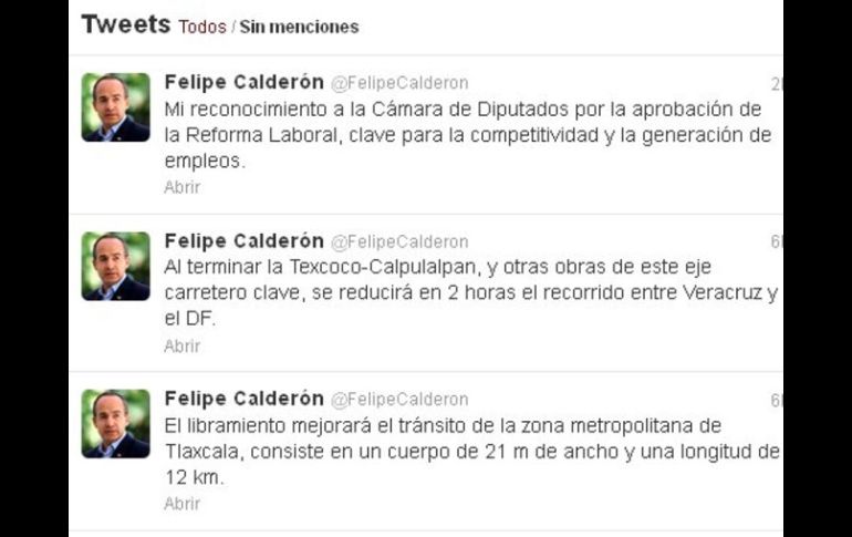 México | El Mandatario señala que la legislación es ''clave'' para la competitivid Calderón reconoce a diputados por reforma laboral El Mandatario subrayó que esa legislación es ''clave'' para la competitividad y la generación de empleos Por: NTX 8 de noviembre de 2012 - 19:21 hs Calderón reaccionó tras la aprobación esta tarde de la reforma. ESPECIAL / CIUDAD DE MÉXICO (08/NOV/2012).- El Presidente Felipe Calderón Hinojosa hizo un reconocimiento a la Cámara de Diputados por la aprobación de la reforma laboral, que requirió de un intenso debate en ese órgano legislativo. El Mandatario subrayó que esa legislación es "clave" para la competitividad y la generación de empleos. Calderón Hinojosa escribió un mensaje en su cuenta de la red social Twitter en la que expresó: "mi reconocimiento a la Cámara de Diputados por la aprobación de la reforma laboral, clave para la competitividad y la generación de empleos". Temas Gobierno de México Felipe Calderón Diputados Reforma Laboral Lee También Clima en Ciudad de México hoy: el pronóstico para el sábado 18 de octubre de 2025 Cámara de Diputados aprueba en lo general la Ley de Ingresos 2026 Hoy No Circula Sabatino: Autos que descansan este 18 de octubre en CDMX y Edomex No solo el de 20 pesos, estos son los billetes en proceso de retiro Recibe las últimas noticias en tu e-mail Todo lo que necesitas saber para comenzar tu día Registrarse implica aceptar los Términos y Condiciones