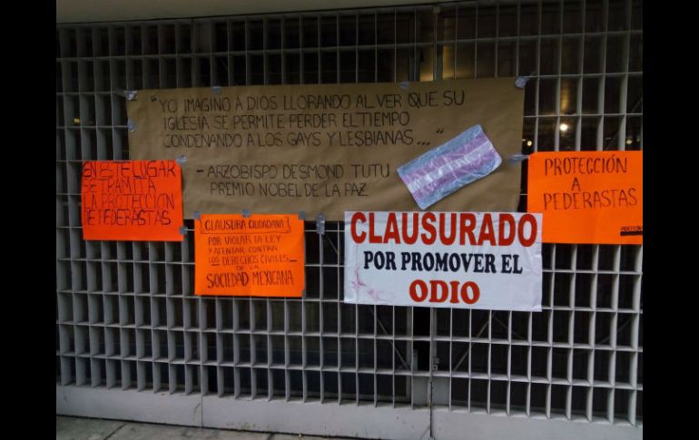 CIUDAD DE MÉXICO (22/AGO/2016).- Integrantes de la comunidad LGBTTTI se manifestaron en las instalaciones de la Arquidiócesis de México en demanda del cese de declaraciones que incitan a la discriminación de esta comunidad.Al clausurar de manera simbólica la sede del órgano eclesiástico, miembros de la organización ProDiana llamaron a la Comisión Nacional de Derechos Humanos (CNDH) emitir una recomendación "clara y contundente" a los ministros de culto que emitan discursos discriminatorios."Venimos a denunciar públicamente a los cardenales de este país, sus mensajes que incitan a la violencia contra la comunidad LGBTTTI, en el semanario Desde la Fe nos exhiben, nos arriesgan, por culpa de esos comentarios personas de esta comunidad son asesinadas", acusó Diana Sánchez Barrios, presidenta de la organización ProDiana.Sánchez Barrios también comentó que en los próximos días buscarán una reunión con la Cámara de Diputados para exigirles que haya una regulación sobre este "lenguaje discriminatorio y violento", para que sean multados los ministros de culto que emitan este tipo de declaraciones.La Arquidiócesis de México recibió a una comitiva de integrantes de la comunidad LGBTTTI que se manifestaban en las instalaciones del órgano eclesiástico en demanda del cese de declaraciones que incitan a la discriminación de esta comunidad.El padre Álvaro Lazcano, encargado de la comisión de cultura de la Arquidiócesis de México recibió a una comitiva de loa manifestantes dijo que buscarán establecer un diálogo entre el cardenal Norberto Rivera y la comunidad LGBTTTI."Con paciencia las cosas se dan si hay voluntad de diálogo y tranquilidad se puede dar sin lugar a dudas, todos tenemos que crecer podemos sentirnos a veces ofendidos, definitivamente y nosotros como Iglesia nos podemos sentir ofendidos, pero hay que buscar caminos de diálogo", dijo.