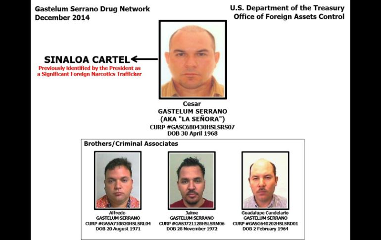 México | El bloqueo de las cuentas aplica también para sus hermanos, declarados narcotraficantes Congela EU bienes a proveedor del Cártel de Sinaloa El bloqueo de las cuentas aplica también para sus hermanos, declarados narcotraficantes Por: SUN 23 de diciembre de 2014 - 11:52 hs Gastélum es señalado como el distribuidor de cocaína más importante en Centroamérica. ESPECIAL / CIUDAD DE MÉXICO (23/DIC/2014).- El Departamento del Tesoro de Estados Unidos congeló los bienes César Gastélum Serrano y tres de sus hermanos al declararlos narcotraficantes especialmente designados de conformidad con Ley de Designación de Cabecillas Extranjeros del Narcotráfico. César, Alfredo, Jaime, y Guadalupe Candelario Gastélum son acusados de abastecer de cocaína al Cártel de Sinaloa, por lo que todos sus activos en Estados Unidos o en control de personas estadounidenses están congelados. ''Con el apoyo de sus hermanos, César Gastélum Serrano ha sido capaz de establecerse como uno de los proveedores de cocaína más productivos del cártel de Sinaloa de México'', expresó el Director de la OFAC, Adam J. Szubin. ''Al designar a Gastélum y a varios de sus aliados principales, una vez más estamos impidiendo las actividades ilícitas de este violento cártel de la droga''. De acuerdo con un comunicado del la Oficina de Asuntos Públicos del Departamento del Tesoro de Estados Unidos, César Gastélum Serrano utiliza una extensa red criminal para transportar de por aire, tierra y mar grandes cantidades cocaína a través de Honduras y Guatemala hacia México. Gastélum Serrano, quien desde 2009 fue identificado como narcotraficante por autoridades de Estados Unidos, es señalado como el más importante distribuidor de cocaína en Centroamérica para el Cártel de Sinaloa, informa el Departamento del Tesoro estadounidense. En tanto, los tres hermanos de César Gastélum son acusados de prestar apoyo directo en el tráfico de estupefacientes. Desde junio del año 2000, más de mil 700 empresas e individuos han sido nombrados conforme a la Ley Kingpin por su participación en el tráfico internacional de narcóticos. Las sanciones por violaciones a la Ley de Cabecillas fluctúan entre penas civiles de hasta mil 075 millones de dólares por cada violación a penas criminales más severas. El castigo para directivos de empresas puede ser de hasta 30 años de prisión y multas de hasta cinco millones de dólares. Conoce el boletín emitido por el Departamento del Tesoro de Estados Unidos. Temas Narcotráfico Crimen Organizado Estados Unidos OFAC Lee También Reportan dos muertos por lluvias en México Trump amenaza con "incremento masivo" de aranceles a China El efecto Donald Trump Mundial Sub-20: EU golea a Italia y enfrentará a Marruecos Recibe las últimas noticias en tu e-mail Todo lo que necesitas saber para comenzar tu día Registrarse implica aceptar los Términos y Condiciones