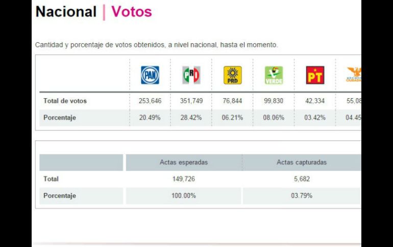 México | De acuerdo a las actas computadas hasta ahora, el PRI lleva una tendencia victoriosa Dan resultados preliminares de diputados federales De acuerdo a las actas computadas hasta ahora, el PRI lleva una tendencia victoriosa Por: NTX 7 de junio de 2015 - 20:45 hs El PRD, el PVEM, Morena y el PT son los que siguen en el número de votos. ESPECIAL / http://www.ine.mx/2015/PREP CIUDAD DE MÉXICO (07/JUN/2015).- Con el 1.33 por ciento de las actas computadas, el Programa de Resultados Electorales Preliminares Elección (PREP) de Diputados Federales 2015 reporta que el Partido Revolucionario Institucional (PRI) registra una tendencia de votos de 30.06 por ciento. De acuerdo con los primeros datos del PREP, el Partido Acción Nacional (PAN) observa una votación de 20.45 por ciento, el Partido de la Revolución Democrática (PRD) muestra una preferencia de 5.36 por ciento. A su vez, el Partido Verde Ecologista de México ( PVEM) registra una votación de 7.99 por ciento; Morena de 10.16 por ciento, el Partido de Trabajo de 3.43 por ciento, Nueva Alianza de 4.68 por ciento, Movimiento Ciudadano de 4.03 por ciento. En tanto, el Partido Humanista registra una tendencia de 2.32 por ciento, el Partido Encuentro Social de 4.18 por ciento, mientras que los candidatos independientes registran una votación de 1.06 por ciento y los no registrados de 0.36 por ciento, así como un 5.85 por ciento de votos nulos. Temas Política PREP INE - Instituto Nacional Electoral Elecciones intermedias México 2015 Lee También ¿Dónde ver EN VIVO el partido amistoso México vs Ecuador? ¡Korn regresa a México! Esto debes saber sobre la venta de boletos Secretario de Marina asegura que sí se alertó a la población de las fuertes lluvias "La Mañanera" de Sheinbaum de hoy lunes 13 de octubre de 2025 Recibe las últimas noticias en tu e-mail Todo lo que necesitas saber para comenzar tu día Registrarse implica aceptar los Términos y Condiciones