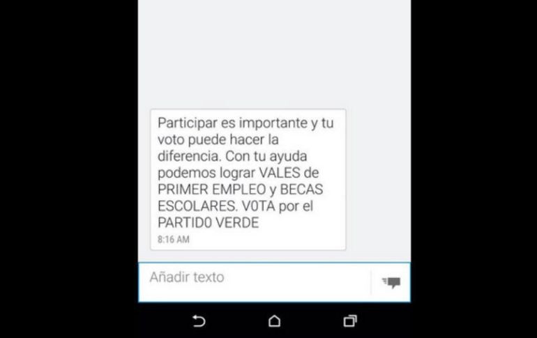 México | El partido ecologista envía mensajes vía celular Denuncian en redes sociales violación del PVEM a veda electoral El partido ecologista envía mensajes vía celular, en donde invita a los ciudadanos a votar por su partido Por: SUN 7 de junio de 2015 - 12:31 hs El PAN denuncia ante el INE que el partido se promicione a través de personajes como 'El Piojo' Herrera. TWITTER / @DaniellBautista CIUDAD DE MÉXICO (07/JUN/2015).- Usuarios en redes sociales denunciaron que el Partido Verde Ecologista de México ( PVEM) envió mensajes vía celular que violan la veda electoral. Bajo el hashtag #SMSdelVerde, usuarios informaron que el partido ecologista invitó a participar en la jornada electoral y a seleccionarlos en los comicios. "Participar es importante y tu voto puede hacer la diferencia. Con tu ayuda podemos lograr vales de primer empleo y becas escolares", se lee en las imágenes difundidas en la web. Hasta el momento el Partido Acción Nacional (PAN) también denunció ante el Consejo General del Instituto Nacional Electoral ( INE) que el partido se promocionaba en periodo de veda a través de personajes populares como el técnico de la selección mexicana, Miguel "El Piojo" Herrera. Temas PAN Política PVEM INE - Instituto Nacional Electoral Elecciones intermedias México 2015 Lee También Enfrentamiento por error entre Guardia Nacional y Policía de Sinaloa deja un muerto Lista actualizada de selecciones que ya clasificaron al Mundial 2026 La edad de riesgo de padecer un trastorno mental, según expertos CIBanco: ¿A partir de cuándo comienza el cierre de sucursales? Recibe las últimas noticias en tu e-mail Todo lo que necesitas saber para comenzar tu día Registrarse implica aceptar los Términos y Condiciones