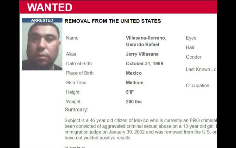 México | Gerardo Rafael Villasana Serrano había reingresado al país tras su deportación en 2008 Detienen en Chicago al mexicano 'más buscado' por inmigración Gerardo Rafael Villasana Serrano había reingresado al país tras su deportación en 2008 Por: AP 11 de abril de 2016 - 21:49 hs Villasana será enviado de regreso a México pero antes deberá cumplir una pena por el reingreso ilegal al país. ESPECIAL / www.ice.gov CHICAGO, ESTADOS UNIDOS (11/ABR/2016).- El mexicano Gerardo Rafael Villasana Serrano, que ocupaba el primer lugar en la lista de los buscados de la Oficina de Inmigración y Aduanas (ICE), fue detenido en el área de Chicago, informó hoy la dependencia. La captura del fugitivo de 46 años, también conocido por el alias de Jerry Villasana, fue realizada el viernes pasado en una estación de gasolina de Arlington Heights, Illinois, por agentes que recibieron un llamado anónimo, según un comunicado de ICE. Villasana integraba la lista de los más buscados desde noviembre del año pasado, cuando se supo que había reingresado ilegalmente a Estados Unidos después de su deportación en 2008. Anteriormente cumplió pena por agresión sexual de un menor en 1991 en el condado Lake. Según el comunicado, Villasana será enviado de regreso a México pero antes deberá cumplir una pena por el reingreso ilegal al país, lo que es considerado un delito grave y puede ser penado con hasta 20 años de prisión federal. Temas Estados Unidos Mexicanos Estados Oficina de Inmigración y Aduanas (ICE) Lee También China amenaza con "pelear hasta el final" si EU mantiene los nuevos aranceles Estos son los estados en alerta por posible propagación de dengue Despliegan operativo tras bloqueos en Chiapas Así se prevé que avance el desarrollo de "Sonia" en México Recibe las últimas noticias en tu e-mail Todo lo que necesitas saber para comenzar tu día Registrarse implica aceptar los Términos y Condiciones