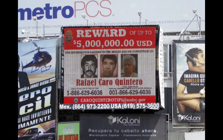 México | Es buscado por el asesinato del agente de la DEA Enrique Camarena EU ofrece recompensa por información sobre Caro Quintero Es buscado por el asesinato del agente de la DEA Enrique 'Kiki' Camarena Por: SUN 11 de junio de 2014 - 15:23 hs CIUDAD DE MÉXICO (11/JUN/2014).- Tres fotografías de Rafael Caro Quintero, aparecen de frente. Los retratos a blanco y negro con bigote tupido; en otra rasurado, porta uniforme color café y en la última se ve un capo viejo de pelo blanco mirando al vacío. El Departamento de Estado, como parte de su programa de recompensas colocó un espectacular en la garita internacional de San Ysidro, que se localiza entre las ciudades de Tijuana y San Diego, en California; la frontera más transitada del mundo. "REWARD" se lee en letras blancas, recompensa, y ofrecen a quien proporcione información sobre su captura cinco millones de dólares. El capo es buscado por el Gobierno de Estados Unidos por el asesinato del agente infiltrado de la DEA, Enrique "Kiki" Camarena en 1985. En el cártel aparecen dos números telefónicos gratuitos para proporcionar información que lleve a la captura del capo: 1-866-629-60-39y 001-866-629-6036 y el correocaroquinterotips@usdoj.gov. "Narcotic reward" lleva por nombre el programa en Estados Unidos para llevar a la captura y extradición de capos en todo el mundo. Fue en noviembre de 2013 que el Departamento de Estado ofreció la recompensa. Miembros del cártel Arellano, Vicente Carrillo, Heriberto Lazcano, Ismael Zambada, Juan Jose Esparragoza-Moreno, han aparecido en diferentes espectaculares. En la página electrónica de recompensas el último en unirse es Rafael Caro Quintero. Detallan que nació el 24 de octubre de 1952, el color del cabello es gris, y sus ojos cafes. En una breve reseña explican que cruzó toneladas de mariguana a Estados Unidos y torturó y asesinó al agente especial Enrique Camarena. Temas Crimen Organizado Estados Unidos Frontera México EU Rafael Caro Quintero Recibe las últimas noticias en tu e-mail Todo lo que necesitas saber para comenzar tu día Registrarse implica aceptar los Términos y Condiciones