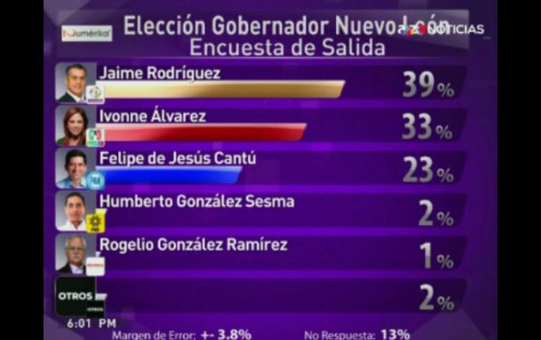 México | El independiente va por delante de la candidata del PRI, según resultados previos 'El Bronco', a la cabeza en encuestas preliminares en NL El independiente va por delante de la candidata del PRI, según resultados previos Por: EL INFORMADOR 7 de junio de 2015 - 17:11 hs Jaime Rodríguez, candidato independiente por la gubernatura de Nuevo León. ESPECIAL / GUADALAJARA, JALISCO (07/JUN/2015).- A minutos del cierre de las votaciones, TV Azteca arroja las encuestas preliminares de salida con un nivel de confianza del 45 por ciento para el estado de Nuevo León. El resultado de candidatos para la gubernatura de Nuevo León, coloca al candidato independiente Jaime Rodríguez ''El Bronco'', a la cabeza con un 39% de las preferencias. Le sigue la candidata del PRI, Ivonne Álvarez con el 33 por ciento. El aspirante del PAN, Felipe de Jesús Cantú, ocupa el tercer puesto con el 23 por ciento. En cuarto lugar se encuentra Humberto González Sesma del PRD con el dos por ciento. Por su parte, el canditado de Morena Rogelio González Ramírez, lleva uno por ciento de votos a favor. Temas Política Nuevo León INE - Instituto Nacional Electoral Elecciones intermedias México 2015 Lee También La aparente estabilidad mexicana La embriaguez del poder: cuando el alma se emborracha de sí misma Ni tan buenos ni tan malos Clima en Ciudad de México hoy: el pronóstico para el domingo 12 de octubre de 2025 Recibe las últimas noticias en tu e-mail Todo lo que necesitas saber para comenzar tu día Registrarse implica aceptar los Términos y Condiciones