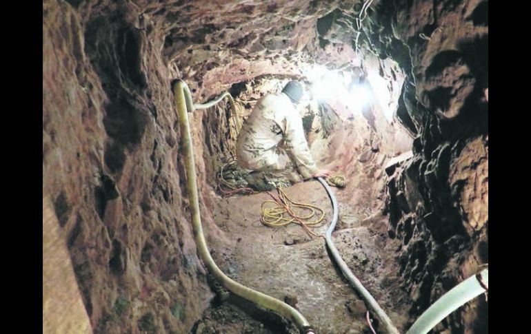 México | Autoridades presumen que era utilizado para trasladar droga El Ejército descubre un narcotúnel en Nogales El túnel medía 56 metros de longitud y estaba a unos metros de la frontera con Estados Unidos Por: SUN 11 de enero de 2013 - 03:48 hs Las excavaciones avanzaban hasta la valla internacional, les faltaban solamente cinco metros para que alcanzaran a cruzar la frontera. SUN / NOGALES, SONORA (11/ENE/2013).- El primer túnel del 2013 presuntamente utilizado para trasladar droga, fue localizado este jueves por el Ejército Mexicano en un domicilio de la colonia Buenos Aires, a unos metros de la valla internacional. El túnel medía 56 metros de longitud en tres niveles descendentes, con 7.5 metros en su parte más profunda, 1.5 metros de altura por un metro de ancho. Las excavaciones descendían y avanzaban hasta la valla internacional, pero les faltaba solamente cinco metros para que alcanzaran a cruzar a Estados Unidos. Temas Narcotráfico Ejército Estados Sonora Recibe las últimas noticias en tu e-mail Todo lo que necesitas saber para comenzar tu día Registrarse implica aceptar los Términos y Condiciones