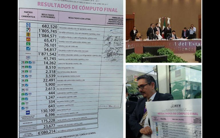 TOLUCA, ESTADO DE MÉXICO (08/AGO/2017).- La coalición encabezada por el PRI y su candidato Alfredo del Mazo Maza, logró dos millones 40 mil 709 votos; en tanto que la candidata de Morena, Delfina Gómez logró un millón 871 mil 542 en la elección a gobernador del Estado de México, lo que representa una diferencia de 169 mil 167 sufragios, 2.78% por lo que no se da el supuesto de ordenar el recuento toda vez que la diferencia entre el primero y segundo lugar es mayor al 1%, señalaron los consejeros electorales, presididos por Pedro Zamudio Godínez.Los siete consejeros del IEEM aprobaron a las 17:38 el cartel del cómputo final de la elección de gobernador para el periodo 2017 y 2023, donde aparece el candidato de la coalición del PRI con mayor número de votos, seguido de Morena, PRD con un millón 84 mil 571 y el PAN en cuarto lugar con 682 mil 520 sufragios.Luego de casi ocho horas de sesión ininterrumpida del consejo general del IEEM, en la que se realizó el cómputo final de la elección de gobernador, se llevó a cabo el conteo final y ordenaron la colocación de la sábana de resultados en las puertas interiores del IEEM.En tanto afuera se mantienen cientos de militantes de Morena exigiendo legalidad y retirando su petición de "voto por voto, casilla por casilla"; donde Horacio Duarte reiteró que no caerán en la provocación, no romperán un solo vidrio que justifique un acto de represión y que continuarán la lucha por la vía electoral.En el cómputo final de la elección aumentó el número de votos nulos con 23 mil 677 sufragios que anuló el Tribunal Electoral del Estado de México, que se sumaron a los 175 mil 228 que ya existían, que sumados dan 198 mil 901 sufragios, por lo que esta cifra es mayor que la diferencia entre el primero y el segundo lugar de esta elección de gobernador, lo que es causal para llevar a cabo el conteo de todas las casillas, apuntó Ricardo Moreno Bastida, representante de Morena, solicitud que fue rechazada por la mayoría de los consejeros electorales del IEEM, con el voto a favor del consejero Gabriel Corona Armenta.A las 17:52 aún falta el punto 4 de la orden del día, que el que se emitirá el acuerdo de validez de la elección y de gobernador electo del Estado de México y expedir la constancia de mayoría al futuro mandatario mexiquense.