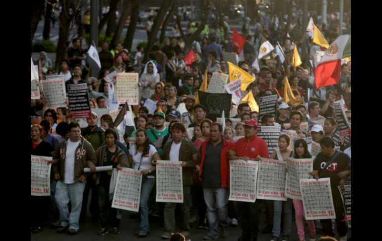 México | Anuncian movilización coordinada para ratificar la presentación con vida de normalistas Estudiantes concluyen marcha y mitin en Monumento a la Revolución Anuncian movilización coordinada para ratificar la presentación con vida de normalistas de Ayotzinapa Por: SUN 16 de noviembre de 2014 - 18:50 hs La movilización que salió a las 16:30 horas del Ángel de la Independencia arribó a las 18:00 horas al Monumento a la Revolución. SUN / J. Boites CIUDAD DE MÉXICO (16/NOV/2014).- Estudiantes de universidades públicas y privadas, así como normalistas de Ayotzinapa, anunciaron una movilización coordinada para el 20 de noviembre a la que se incorporarán organizaciones obreras, campesinas y de la sociedad civil para ratificar la presentación con vida de los alumnos desaparecidos en Iguala. Durante el mitin en el que se calcula acudieron poco más de tres mil personas, se presentó como único orador José Solano, alumno de la Normal de Ayotzinapa, para hacer un llamado a participar en las tres marchas que habrá el próximo 20 de noviembre. La primera marcha agrupará a estudiantes de la asamblea universitaria y saldrá de la Plaza de las Tres Culturas; la segunda de los trabajadores y organizaciones campesinas que saldrán del Monumento a la Revolución, y la tercera de las organizaciones sociales y la sociedad civil que caminarán desde el Ángel de la Independencia, todas ellas rumbo al Zócalo capitalino . A nombre de los familiares de los normalistas desaparecidos en Iguala, José Solano dijo que las pruebas que hasta ahora ha presentado la Procuraduría General de la República (PGR) "son insostenibles y por eso estamos en las calles". Raúl Romero, estudiante de la UNAM, repudió a nombre de los presentes la intervención policiaca en instalaciones de Ciudad Universitaria la mañana del sábado, en donde un policía disparó contra de dos estudiantes. La movilización que salió a las 16:30 horas del Ángel de la Independencia arribó a las 18:00 horas al Monumento a la Revolución y culminó con un breve mitin y entre consignas de "¡Fuera Peña!", a lo que se agregó "¡Fuera Narro!". Se retiraron del lugar sin mayores incidentes, luego de que grupos de encapuchados y embozados realizaron pintas en sucursales bancarias y hoteles de la avenida Reforma. Temas UNAM Estados Manifestaciones en la Cd. de México Desapariciones y denuncias Recibe las últimas noticias en tu e-mail Todo lo que necesitas saber para comenzar tu día Registrarse implica aceptar los Términos y Condiciones