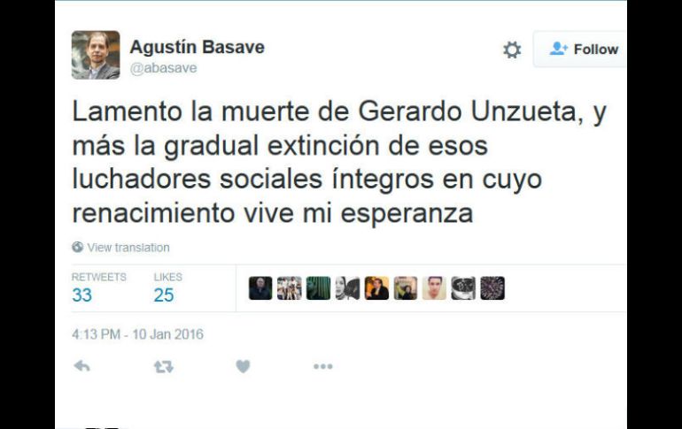 México | Es considerado personaje importante en los comités de partidos de izquierda en México Fallece Gerardo Unzeta, fundador del PRD Es considerado personaje importante en los comités de partidos de izquierda en México Por: SUN 11 de enero de 2016 - 07:16 hs Agustín Basave, líder nacional del PRD, expresó en su cuenta de Twitter su pesar por el deceso. ESPECIAL / Twitter CIUDAD DE MÉXICO (11/ENE/2016).- A los 90 años de edad falleció este domingo Gerardo Unzueta Lorenzana, fundador del Partido de la Revolución Democrática (PRD) y militante de izquierda de toda la vida. Unzueta militó y fue integrante de los Comités Centrales del Partido Comunista Mexicano, al que perteneció de 1946 a1981, y del Partido Socialista Unificado de México durante el periodo 1981-1988. Además fue militante del Partido Mexicano Socialista de 1988-1989, partido que cedió su registro para la fundación del PRD en 1989. Unzueta nació el 3 de octubre de 1925 en Tampico, Tamaulipas. Estudió derecho y artes plásticas en la Universidad Nacional Autónoma de México (UNAM), fue periodista, ensayista, novelista y editor de la revista Coyuntura del Instituto de Estudios de la Revolución Democrática (IERD). El líder nacional del PRD, Agustín Basave, expresó en su cuenta de twitter su pesar por el deceso: "Lamento la muerte de Gerardo Unzueta, y más la gradual extinción de esos luchadores sociales íntegros en cuyo renacimiento vive mi esperanza". Temas PRD Política Partidos políticos Decesos de personalidades Agustín Basave Lee También Futbol hoy 11 de octubre de 2025: ¿Dónde ver los partidos en vivo? Fallece John Lodge, bajista de The Moody Blues ¿Dónde ver EN VIVO el partido amistoso México vs Colombia? Dónde ver EN VIVO el México vs Argentina por el Mundial Sub-20 Recibe las últimas noticias en tu e-mail Todo lo que necesitas saber para comenzar tu día Registrarse implica aceptar los Términos y Condiciones