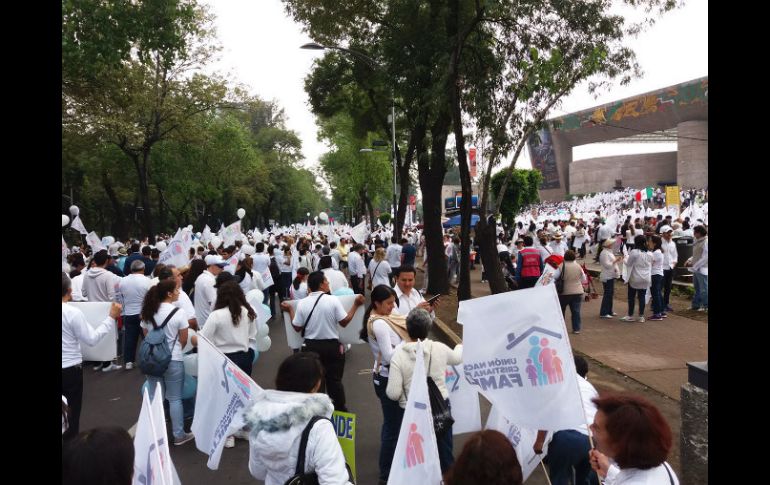 CIUDAD DE MÉXICO (24/SEP/2016).- Alrededor de las 12:15 horas inició la caminata del Frente por las Familias sobre avenida Paseo de la Reforma con rumbo al Ángel de la Independencia.A la vanguardia de la marcha lucen pancartas con leyenda "Por nuestros hijos, el matrimonio y la familia". Además mientras caminan se escuchan vítores como "¡La familia, unida, jamás será vencida!" y "Se ve, se siente, la familia está presente".Entre los asistentes, se encuentran grupos provenientes de Jalisco que salieron en 30 camiones la noche del viernes.Los organizadores esperan presencia de representantes de todas las entidades del país.Por la manifestación que arranca en el Auditorio Nacional, la circulación en avenida Reforma está cerrada desde la Fuente de Petróleos al Oriente.Luis Gallego, vocero de la Unión Nacional Cristiana por la Familia, dijo que el objetivo de esta marcha es que los legisladores "consideren el menaje de venir a marchar a favor de la familia, en contraste con la iniciativa presidencial".Aseguró que el contingente mostrará una actitud de respeto ante los integrantes del Frente Orgullo Nacional MX una vez que arriben al Ángel de la Independencia.