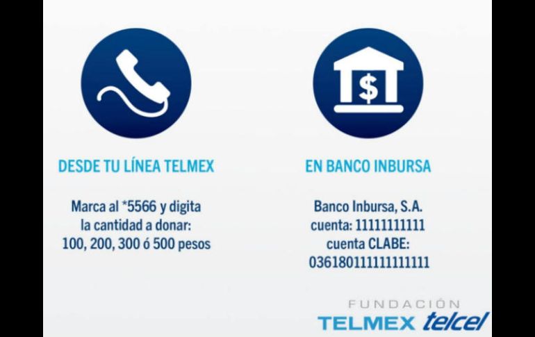 GUADALAJARA, JALISCO (20/SEP/2017).- Esta mañana, la Fundación Carlos Slim dio a conocer a través de sus redes sociales y página de internet la implementación de una campaña de donación para los afectados por el sismo ocurrido la tarde de ayer en la Ciudad de México.''Debido a los graves daños provocados por los recientes sismos que impactaron a México, Fundación Carlos Slim, Fundación Telmex - Telcel, así como Telcel y Telmex ampliaron su campaña para aportar cinco pesos por cada peso que la sociedad done'', dice el comunicado difundido.La fundación apunta que los recursos que se capten se destinarán a la atención de la emergencia, así como en la reconstrucción de escuelas y centros de salud.Datos para donaciónDesde tu Plan TelcelEnvía un SMS con la cantidad a donar: 100, 200, 300, 500 pesos al 55666Desde tu Línea TelmexMarca al *5566 y digita la cantidad a donar: 100, 200, 300, 500 pesosEn Banco InbursaCuenta: 11111111111 Cuena Clabe: 036180111111111111