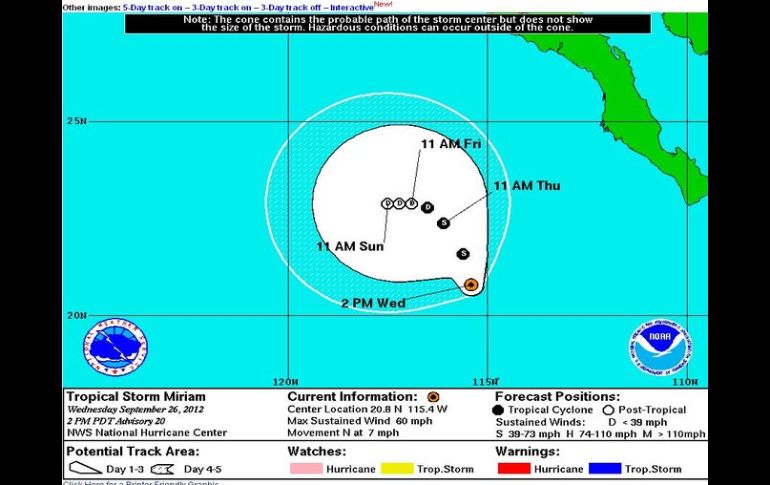 México | 'Miriam' continúa debilitándose y tiene vientos de 100 kilómetros por hora Gira tormenta 'Miriam' y se aleja de Baja California El centro de la tormenta se ubicaba 680 kilómetros al oeste-suroeste de Baja California Sur y se desplazaba en dirección norte-noroeste Por: NTX 26 de septiembre de 2012 - 18:04 hs Se pronostica que este miércoles siga un movimiento lento hacia el norte-noroeste. ESPECIAL / MIAMI, ESTADOS UNIDOS (26/SEP/2012).- La tormenta tropical 'Miriam' dio hoy un giro hacia el noroeste, en una trayectoria en la que se alejará de la costa de Baja California, México, informó el Centro Nacional de Huracanes (CNH) de Estados Unidos. 'Miriam' continúa debilitándose y tiene vientos de 100 kilómetros por hora, señaló la dependencia en un boletín. El centro de la tormenta se ubicaba 680 kilómetros al oeste-suroeste de Baja California Sur y se desplazaba en dirección norte-noroeste a una velocidad de nueve kilómetros por hora. Se pronostica que este miércoles siga un movimiento lento hacia el norte-noroeste, seguido de un giro hacia el noroeste mañana viernes, con lo que se alejará de la costa mexicana, de acuerdo con los pronósticos de largo plazo de la dependencia. Temas Estados Clima Tormenta tropical Baja California Sur Lee También Clima en Chapala hoy: el pronóstico para el domingo 12 de octubre de 2025 Clima en El Salto hoy: el pronóstico para el domingo 12 de octubre de 2025 Clima en Guadalajara hoy: el pronóstico para el domingo 12 de octubre de 2025 Clima en Mazamitla hoy: el pronóstico para el domingo 12 de octubre de 2025 Recibe las últimas noticias en tu e-mail Todo lo que necesitas saber para comenzar tu día Registrarse implica aceptar los Términos y Condiciones