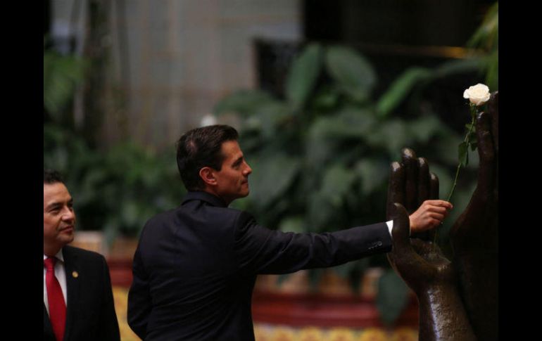 GUATEMALA, GUATEMALA (06/JUN/2017).- El Presidente de México, Enrique Peña Nieto, fue nombrado "embajador de la paz de Guatemala" por el mandatario Jimmy Morales, en una ceremonia celebrada en la capital guatemalteca.Peña Nieto, que cumple este martes una visita a Guatemala de un solo día, y su comitiva fueron recibidos por Morales y su Gabinete de Gobierno en el Palacio Nacional de la Cultura, una de las dependencias del Ejecutivo.Los mandatarios escucharon los himnos nacionales de ambos países y tuvieron una intervención previa a que el Presidente mexicano protagonizara la ceremonia del Cambio de la Rosa, que lo convierte en embajador de la paz de Guatemala.Esta ceremonia pretende reivindicar el espíritu que permitió el 29 de diciembre de 1996 el acuerdo de paz entre el Gobierno y la guerrilla de Guatemala, con el que se puso fin a una guerra civil iniciada en 1960 y que provocó más de 250 mil víctimas, entre muertos y desaparecidos.El Cambio de la Rosa de la paz, que se celebra en un monumento levantado en 1997, conmemora ese histórico acontecimiento y el acto simbólico es para reconocer a guatemaltecos y extranjeros que han contribuido al proceso de pacificación en el país centroamericano.Ambos mandatarios mostraron su deseo de seguir profundizando en las relaciones bilaterales, comerciales y políticas que mantienen.Los dos países establecieron sus vínculos el 6 de septiembre de 1848 y durante este tiempo han firmado más de 40 acuerdos bilaterales, 21 de ellos entre 2013 y 2016, sobre todo centrados en desarrollo, prosperidad y seguridad, particularmente para las poblaciones de la zona fronteriza.