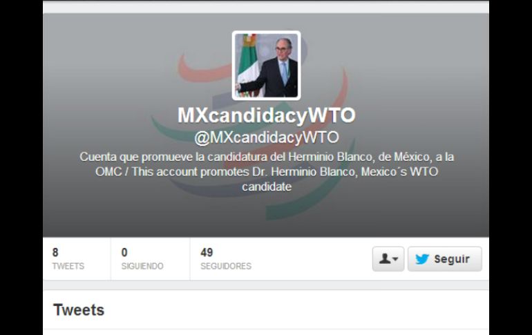 México | La SRE da a conocer una cuenta que promueve la candidatura de Blanco Impulsan en Twitter candidatura de Blanco a OMC La SRE da a conocer una cuenta que promueve la candidatura de Blanco a la Dirección General de la OMC Por: NTX 1 de marzo de 2013 - 21:58 hs La cuenta en Twitter fue abierta este viernes y difundida por la cancillería mexicana. TOMADA DE @MXcandidacyWTO / CIUDAD DE MÉXICO (01/MAR/2013).- La Secretaría de Relaciones Exteriores (SRE) dio a conocer una cuenta en Twitter que promueve la candidatura de Herminio Blanco a la Dirección General de la Organización Mundial del Comercio (OMC). La cuenta @MXcandidacyWTO, que fue abierta este viernes y difundida por la cancillería mexicana, presentaba ocho mensajes en las últimas dos horas. Se señala que Herminio Blanco, candidato a la Dirección General de la OMC, tiene 27 años promoviendo el libre comercio; además destaca su papel en los cambios estructurales por los que México es una economía más abierta y competitiva. Asimismo se anota en inglés y en español que Blanco fue secretario de Comercio e Industria y subsecretario de Negociaciones Comerciales Internacionales en el país. Hasta las 21:45 horas tenía 45 seguidores. Temas Economía Mexicana OMC Recibe las últimas noticias en tu e-mail Todo lo que necesitas saber para comenzar tu día Registrarse implica aceptar los Términos y Condiciones