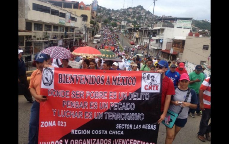 México | La intención no es confrontarse con la ciudadanía, aseguran manifestantes Inicia megamarcha en Acapulco por caso Iguala Piden justicia por el asesinato de seis personas, entre ellas tres normalistas de Ayotzinapa Por: SUN 17 de octubre de 2014 - 11:24 hs Vista de uno de los contingentes que marchan este día en Acapulco. TWITTER / @SubVersionesAAC ACAPULCO, GUERRERO (17/OCT/2014).- Un contingente de alrededor de cuatro mil personas, entre maestros e integrantes de organizaciones sociales, partió de la calzada Pie de la Cuesta y se dirigía al punto conocido como La Diana Cazadora, en el marco de una jornada de protestas por el caso Iguala. El secretario general de la Sección 14 de la Coordinadora Nacional de Trabajadores de la Educación ( CNTE), Ramos Reyes Guerrero, declaró antes de que partiera la marcha que la intención no es confrontarse con la ciudadanía de Acapulco, sino exigir justicia por el asesinato de seis personas, entre ellas tres normalistas de Ayotzinapa. Además, dijo, para pedir a las autoridades de que presenten con vida a 43 estudiantes desaparecidos. En tanto, el secretario general de la Sección 22 de Oaxaca, Rubén Núñez, reiteró que el magisterio de ese estado se solidariza por completo con las demandas en Guerrero. Asimismo, comentó que en por lo menos siete estados del país, paralelo a esta movilización, hay manifestaciones de maestros de la CNTE para exigir la renuncia del gobernador Ángel Aguirre, la desaparición de poderes, pero sobretodo justicia por el caso Iguala. Se observaron cartulinas de la ciudadanía en apoyo al movimiento, que se aglutinó en la Asamblea Nacional Popular, en las que se leía: "Vivos se los llevaron, vivos los queremos", "Si no hay justicia para el pueblo, que no haya paz para el gobierno". Temas Estados Guerrero CNTE Acapulco Manifestaciones en México Desapariciones y denuncias Lee También Esta es la verdadera identidad del "Juan Gabriel" captado en París t.A.T.u anuncia concierto en México: precio de boletos y cuándo salen a la venta ¿Será obligatorio presentar la CURP biométrica para trámites escolares? Día de Muertos 2025: ¿Por qué será más caro el Pan de Muerto este año? Recibe las últimas noticias en tu e-mail Todo lo que necesitas saber para comenzar tu día Registrarse implica aceptar los Términos y Condiciones