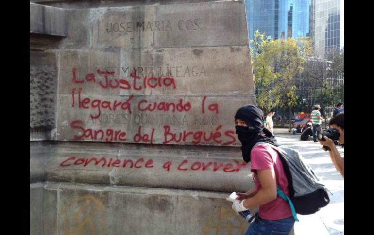 México | Realizaron pintas en la base del monumento durante la marcha por Ayotzinapa Jóvenes encapuchados pintan el Ángel de la Independencia Realizaron pintas en la base del monumento durante la marcha por Ayotzinapa Por: SUN 26 de febrero de 2015 - 17:32 hs La marcha de la novena Acción Global por Ayotzinapa partió del Ángel de la Inpendencia, donde realizaron las pintas en protesta. SUN / J. Sánchez CIUDAD DE MÉXICO (26/FEB/2015).- Un grupo de jóvenes encapuchados llegaron al Ángel de la Independencia donde realizaron algunas pintas como el signo del anarquismo, así como consignas como "no es por Ayotzi, es por nuestro futuro" y "la justicia llegará cuando la sangre del burgués comience a correr". Dos sujetos subieron a las estatuillas que se encuentran a los pies del monumento y de igual forma los pintaron. Entre empujones y gritos, los jóvenes se cubren de que fotógrafos capturen su imagen. Los encapuchados se dispersaron entre los manifestantes. Temas Estados Distrito Federal Manifestaciones en la Cd. de México Caso Ayotzinapa Lee También Lista actualizada de selecciones que ya clasificaron al Mundial 2026 La edad de riesgo de padecer un trastorno mental, según expertos Esta es la ubicación de las presas que abastecen al Sistema Cutzamala Reportan dos muertos por lluvias en México Recibe las últimas noticias en tu e-mail Todo lo que necesitas saber para comenzar tu día Registrarse implica aceptar los Términos y Condiciones