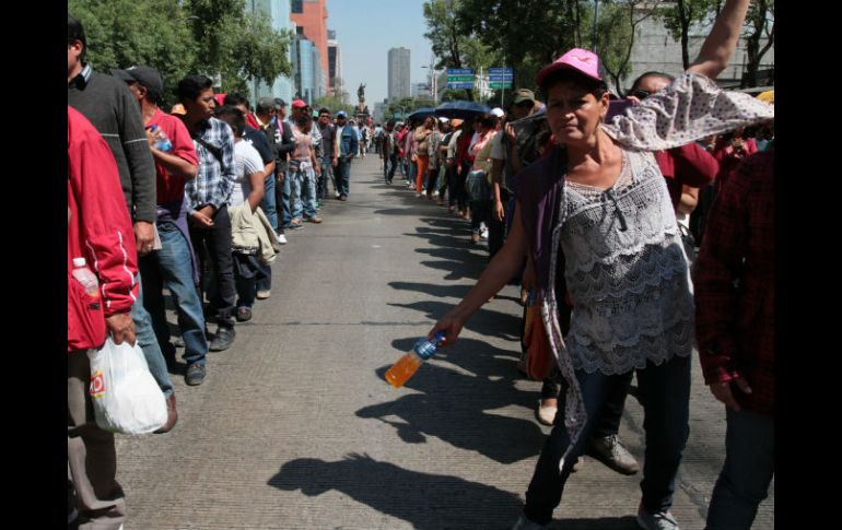 México | Los manifestantes esperan a que la comitiva que entró a Gobernación salga del diálogo La CNTE se concentra en Reforma Los manifestantes esperan a que la comitiva que entró a Gobernación salga del diálogo Por: SUN 10 de febrero de 2015 - 19:27 hs CIUDAD DE MÉXICO (10/FEB/2015).- Maestros de la Coordinadora Nacional de Trabajadores de la Educación ( CNTE) que exigen al Gobierno federal el pago de sus salarios pendientes se concentran este martes en la Glorieta Bicentenario, que se encuentra en el cruce de Reforma y Bucareli, en la zona centro de esta capital. Elementos de la policía de tránsito liberaron los carriles centrales de Reforma, en el tramo que abarca de la Glorieta del Ángel a Insurgentes, con dirección al Centro Histórico. Granaderos de la Secretaria de Seguridad Pública del Distrito Federal ( SSPDF) resguardan las inmediaciones del Monumento a la Revolución, así como otros edificios de gobierno para actuar si se llega a alterar la paz pública. Los manifestantes esperan a que una comitiva que ingresó a la Secretaría de Gobernación salga e informe cuáles han sido los resultados de la mesa de negociación que dio inicio al mediodía. Los docentes partieron a las 12:00 horas del Monumento a la Revolución, hacia Los Pinos, pero en la Glorieta del Ángel de la Independencia decidieron regresar hacia la Secretaría de Gobernación. Temas Estados Distrito Federal CNTE Manifestaciones en la Cd. de México Recibe las últimas noticias en tu e-mail Todo lo que necesitas saber para comenzar tu día Registrarse implica aceptar los Términos y Condiciones