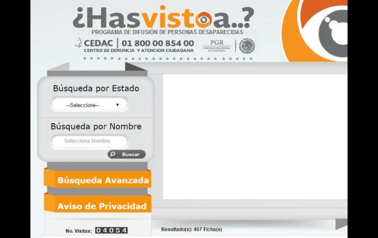 México | La dependencia federal pone en operación la página web '¿Has visto a...?' La PGR lanza portal para búsqueda de desaparecidos La dependencia federal pone en operación la página web '¿Has visto a...?', la cual estará en constante actualización Por: SUN 17 de diciembre de 2015 - 14:32 hs El portal permite revisar los registros de personas desaparecidas por entidad federativa, edad, sexo, y nombre. ESPECIAL / app.cedac.pgr.gob.mx CIUDAD DE MÉXICO (17/DIC/2015).- La Procuraduría General de la República (PGR) informó que puso en operación el portal “¿Has visto a…?” para dar difusión permanente a la búsqueda de personas desaparecidas y ofrecer una herramienta tecnológica de cobertura amplia, permanente y en constante actualización. Mediante un comunicado, la PGR detalló que el portal, puede consultarse en esta dirección, permite revisar los registros de personas desaparecidas por entidad federativa, edad, sexo, y nombre; además de verificar las recompensas ofrecidas por la Subprocuraduría de Derechos Humanos, Prevención del Delito y Servicios a la Comunidad. Agregó que se trata de un programa institucional de difusión, de apoyo a familiares de personas desaparecidas y que permite desarrollar cédulas de identificación, carteles y videos. Indicó que para acceder al programa se requiere realizar la denuncia ante la PGR y contar con número de averiguación previa en el ámbito federal. La plataforma también permite el acceso a otros programas, como Alerta Ámber, y realizar denuncias ciudadanas que contribuyan a la localización de personas. Dentro de su página institucional, pueden consultarse las características del programa y sus beneficios, así como en el teléfono 01 800 00 854 00 del Centro de Denuncia y Atención Ciudadana (CEDAC). Temas PGR Política Desapariciones y denuncias Lee También Trump ve oportunidad de firmar la paz con Irán, pero "primero Rusia" Trump pide indulto para Netanyahu en causas judiciales abiertas en Israel Macron tiene nuevo gabinete y enfrenta un complicado reto La aparente estabilidad mexicana Recibe las últimas noticias en tu e-mail Todo lo que necesitas saber para comenzar tu día Registrarse implica aceptar los Términos y Condiciones