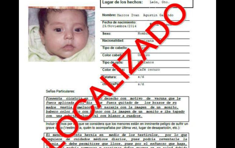 México | Marcos Iván, de tres meses fue hallado con vida en una jardinera Localizan a bebé que había sido raptado en León Marcos Iván, de tres meses fue hallado con vida en una jardinera Por: SUN 30 de marzo de 2015 - 08:11 hs LEÓN, GUANAJUATO (30/MAR/2015).- El bebé Marcos Iván Agustín Galindo, de 3 meses de edad, fue localizado con vida en una jardinera del bulevar Atotonilco, en la colonia Valle del Real, al oriente de la ciudad, luego de diez días de búsqueda y sufrimiento de sus padres. La Procuraduría General de Justicia del Estado ( PGJE) informó que el menor estará bajo valoración médica, sin que hasta este momento se tenga un diagnóstico de su estado de salud. El pasado 19 de marzo, tres sujetos armados le arrebataron a su bebé a Berenice Galindo en la colonia Vibar, lo que desató el enojo de decenas de madres de familia que en dos ocasiones protestaron en las calles en demanda de justicia. A las 21:00 horas de este domingo, vecinos de la colonia Valle del Real reportaron a las autoridades la existencia de un bebé tirado en una jardinera, cerca de la banqueta, por lo que personal de Seguridad Pública se trasladó hasta ese lugar encontrando al pequeño, quien era cuidado por los vecinos. El niño fue trasladado al Hospital Infantil para su revisión médica. Los padres del Marcos Iván fueron informados por personal de la Subprocuraduría de Justicia del Estado sobre la recuperación de su hijo, por lo que en cualquier momento se espera que arriben al Hospital en el que es atendido. Alrededor de las 22:30 horas, la PGJE anunció la desactivación de la Alerta Amber, por la localización del niño, y el anuncio fue retuiteado por el Procurador de Justicia del Estado, Carlos Zamarripa Aguirre. De acuerdo a información proporcionada por la madre, Marcos Iván tiene una hernia y advirtió que si no se le daba atención médica cualquier alteración en su salud podría poner en riesgo su vida. Temas Estados Guanajuato Niños Secuestros en México Alerta Amber Lee También Dólar amanece encarecido este 10 de octubre Pronóstico de lluvia hoy, 10 de octubre, a esta HORA en CDMX "La Mañanera" de Sheinbaum de hoy viernes 10 de octubre de 2025 La distopía de Clara Brugada Recibe las últimas noticias en tu e-mail Todo lo que necesitas saber para comenzar tu día Registrarse implica aceptar los Términos y Condiciones