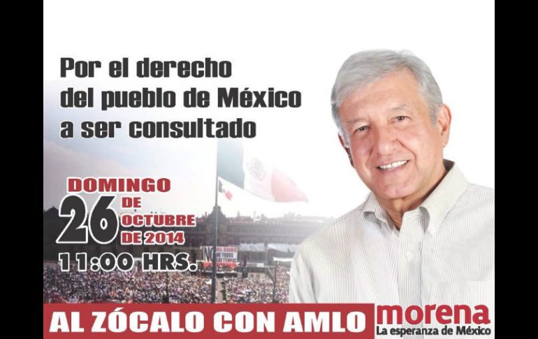 México | Pide a sus seguidores movilizarse en el Zócalo capitalino el 26 de octubre López Obrador convoca a mitin por energética y normalistas El tabasqueño invita a participar en esta movilización ''con responsabilidad y determinación'' Por: SUN 16 de octubre de 2014 - 13:14 hs El tabasqueño hace una invitación al mitin en su página de Facebook. FACEBOOK / Andrés Manuel López Obrador CIUDAD DE MÉXICO (16/OCT/2014).- Andrés Manuel López Obrador pidió a sus seguidores movilizarse en el Zócalo capitalino el 26 de octubre para exigir se concrete la consulta popular en materia energética y definir acciones ante el agravamiento de la crisis en el país, que se refleja en la desaparición de los 43 normalistas de Ayotzinapa. Hace un mes, el presidente del Consejo Nacional del partido Movimiento Regeneración Nacional ( Morena) convocó a manifestarse el día 26 para "evitar que la Suprema Corte de Justicia de la Nación, con argucias legaloides, nos negara el derecho constitucional para celebrar una consulta ciudadana con el tema de la privatización del sector energético". Este jueves el político agregó en su cuenta de Facebook que la movilización también busca analizar medidas a tomar por el caso de los estudiantes desaparecidos en Iguala, Guerrero. "Ahora, aunado a ello (la demanda de consulta) por el asesinato y la desaparición de los jóvenes de la normal rural de Ayotzinapa, Guerrero, y ante el agravamiento de la crisis, necesitamos definir con claridad qué hacer y cómo, en esta circunstancia, vamos a trasformar a México, por la vía pacífica, con la participación consciente y organizada de la gente", escribió en la red social. Empero pidió participar en esta movilización " con responsabilidad y determinación". Temas Reforma Energética Política AMLO Guerrero Manifestaciones en la Cd. de México Morena (Partido político) Lee También Un país donde la salud mental no existe en el presupuesto El precio de la paz en Gaza Clima en Ciudad de México hoy: el pronóstico para el sábado 11 de octubre de 2025 Hoy No Circula Sabatino: Autos que descansan este 11 de octubre en CDMX y Edomex Recibe las últimas noticias en tu e-mail Todo lo que necesitas saber para comenzar tu día Registrarse implica aceptar los Términos y Condiciones