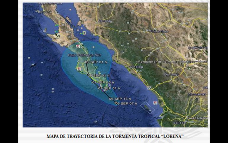 México | La tormenta tropical se encuentra cerca de las costas de Jalisco ''Lorena'' tocaría tierra esta noche en Baja California Sur El meteoro tiene vientos de 65 kilómetros por hora y se pronostica poco cambio en intensidad antes de tocar tierra en algún lugar entre Cabo San Lucas y Todos los Santos Por: NTX 6 de septiembre de 2013 - 07:25 hs Imagen del Servicio Meteorológico Nacional (SMN) de la trayectoria proyectada para ''Lorena''. ESPECIAL / MIAMI, ESTADOS UNIDOS (06/SEP/2013).- La tormenta tropical ''Lorena'' se desplaza en forma paralela a la costa mexicana del Pacífico y se prevé que toque tierra esta noche en la costa oeste de Baja California Sur, informó el Centro Nacional de Huracanes (CNH). ''Lorena'' tiene vientos de 65 kilómetros por hora y se prevé poco cambio en intensidad antes de tocar tierra en algún lugar entre Cabo San Lucas y Todos los Santos, de acuerdo al pronóstico del CNH. Después se debilitará hasta disiparse el sábado o domingo. De acuerdo con el Servicio Meteorológico Nacional (SMN), ''Lorena'' se ubica a 155 kilómetros al sureste de Cabo San Lucas. Se mantiene cerca de las costas de Jalisco y Nayarit y sus bandas nubosas ya tocan la porción sur de la península de Baja California. A las 02:00 tiempo del Pacífico (09:00 GMT), el centro del sistema se ubica a 245 kilómetros al sureste de Cabo San Lucas o a 290 kilómetros al oeste-noroeste de Cabo Corrientes. ''Lorena'' que recién se formó el jueves se desplaza hacia el noroeste a una velocidad de 22 kilómetros por hora y se espera en dirección y en su velocidad. La alerta de tormenta tropical está en efecto para Baja California Sur desde Agua Blanca hasta Buenavista. Mientras que una vigilancia está vigente del norte de Agua Blanca hasta Santa Fe. Temas Estados Tormenta tropical Baja California Sur Lee También Tormenta tropical "Raymond" mantiene en alerta a estos estados el fin de semana ALERTA en Jalisco por formación de ciclón "Raymond" Esta es la última guerra que Trump resolvió, según él mismo Las guerras que Trump dice haber resuelto y por las que merece el Nobel Recibe las últimas noticias en tu e-mail Todo lo que necesitas saber para comenzar tu día Registrarse implica aceptar los Términos y Condiciones