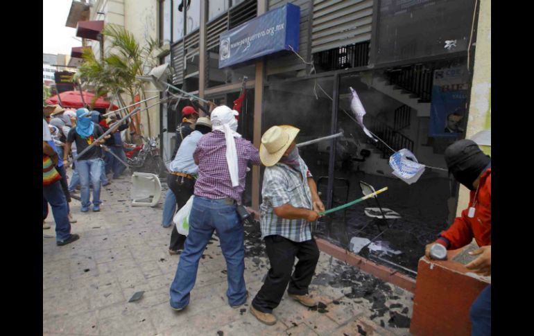 México | La CETEG arremete contra sedes locales del PAN, PRI, PRD y MC Maestros atacan sedes de partidos en Guerrero La CETEG arremete contra sedes locales del PAN, PRI, PRD y Movimiento Ciudadano Por: SUN 24 de abril de 2013 - 14:44 hs Los maestros de Guerrero se manifiestan en contra de la Ley Estatal de Educación aprobada por el Congreso. SUN / CHILPANCINGO, GUERRERO (24/ABR/2013).- Embozados, con tubos y palos, integrantes del magisterio disidente abrieron por la fuerza el acceso principal de la sede estatal del PRI, a donde ingresaron a destruir el inmueble, también pasaron por la del PRD, PAN y Movimiento Ciudadano. Con ausencia de elementos de Seguridad Pública municipal, estatal o federal, los maestros de los grupos disidentes rompieron los macetones de la entrada principal, quebró cristales de oficinas de este instituto político, así como de la Confederación de Trabajadores de México (CTM) que se encuentra en el edificio principal. Además, ingresaron a las oficinas desde donde lanzan sillas, así como otros objetos de oficina. Los maestros además prendieron fuego a varias sillas. Realizaron además pintas como " traidores" en el busto de ex presidente Plutarco Elías Calles. A su paso, los maestros de Guerrero han destrozado las instalaciones de PAN, Movimiento Ciudadano y por segunda ocasión, del PRD en la entidad como protesta a las reformas aprobadas que modifican la Ley Estatal de Educación que dejaron fuera tres de las demandas de la CETEG. También arremetieron contra la casa de Atención Ciudadana del senador perredista Sofío Ramírez, donde destrozaron los vidrios por medio de palazos y con piedras lanzadas con sus resorteras. El Congreso del estado está resguardado por policías antimotines, quienes apostaron todo el perímetro del órgano legislativo ante el posible arribo de los maestros disidentes. Algunos comercios comenzaron a bajar sus cortinas y a cerrar sus negocios ante el paso de la movilización. "No cierres, es contra el gobierno y no contra ustedes", arengó un maestro encapuchado. Incendian planta alta de las oficinas del PRI Maestros incendiaron la planta alta de las oficinas del Partido Revolucionario Institucional, donde las llamas se intensifican. Los docentes incendiaron las instalaciones de las oficinas en su planta alta, donde al igual que en otras sedes partidistas causaron destrozos. El fuego se propaga en el tercer piso del edificio del PRI contiguo al Congreso del estado, donde hay un operativo de los policías estatales. Las oficinas se encontraban desalojadas cuando los mentores llegaron al lugar, luego del incendio los manifestantes se retiraron del lugar y se dirigen al Congreso, inconformes por la reforma educativa estatal aprobada ayer. Temas Estados Guerrero Conflicto Magisterial Recibe las últimas noticias en tu e-mail Todo lo que necesitas saber para comenzar tu día Registrarse implica aceptar los Términos y Condiciones