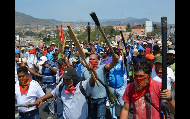 México | El Movimiento Popular Guerrerense exige una solución al conflicto magisterial Maestros irrumpen en Congreso de Guerrero El Movimiento Popular Guerrerense exige la aprobación de su iniciativa de reforma de la Ley Estatal de Educación Por: SUN 18 de abril de 2013 - 14:41 hs El grupo de maestros disidentes realiza una marcha sobre la Autopista del Sol en sus cuatro carriles. NTX / CHILPANCINGO, GUERRERO (18/ABR/2013).- Un grupo de maestros disidentes de Guerrero arremetieron con piedras y palos en contra del inmueble del congreso del estado e irrumpieron de manera violenta en la entrada del recinto legislativo. Mientras una marcha de docentes avanzaba sobre los carriles de la Autopista del Sol, un grupo de ellos tomó las entradas del Congreso local para exigir una solución al conflicto magisterial. A su paso, retiraron dos puertas de cristal de la entrada principal, de este órgano legislativo, en tanto que con piedras reventaron dos cristales de la biblioteca “Sentimientos de la Nación”. El Movimiento Popular Guerrerense realiza una marcha sobre la Autopista del Sol, en sus cuatro carriles, para que el congreso apruebe la iniciativa de reforma del movimiento magisterial disidente para modificar la Ley Estatal de Educación. Buscan que ingrese comisión Una comisión de integrantes de la Coordinadora Estatal de Trabajadores de la Educación de Guerrero (CETEG) busca ingresar para hablar con los legisladores y conocer los avances en el dictamen para reformar la Ley Estatal de Educación. La comisión es encabezada por el secretario general de la CETEG, Gonzalo Juárez y el vocero Minervino Morán. "Hemos venido al Congreso para establecer una mesa de diálogo y ahorita vamos a entrar, ojalá los diputados recapaciten y aprueben de manera íntegra como se leyó la iniciativa en la plenaria el pasado martes", dijo Minervino Morán. Por su parte, cientos de maestros disidentes rodearon los accesos del recinto legislativo. En la explanada, la Policía Comunitaria de Acatempa se encuentra formada en tres filas, portando una bandera de México. Los maestros disidentes usaron varillas y martillos para intentar abrir los candados para tener acceso al salón de plenos donde los legisladores locales sesionan para dictaminar su propuesta de reforma a la Ley Estatal de Educación. Temas Estados Guerrero Conflicto Magisterial Manifestaciones en México Lee También Astros de Jalisco mantiene su constancia, aunque el título del la LNBP sigue pendiente Familiares relatan vivencias de los rehenes liberados en Gaza Vive Latino 2026: Artistas, precios oficiales y fechas de preventa ¿Dónde ver EN VIVO el partido amistoso México vs Ecuador? Recibe las últimas noticias en tu e-mail Todo lo que necesitas saber para comenzar tu día Registrarse implica aceptar los Términos y Condiciones