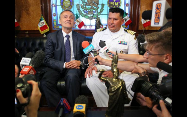 El alcalde de Gdynia, Wojciech Szczurek (i) con el capitán Juan Very (d) en conferencia luego del incidente. ARCHIVO /