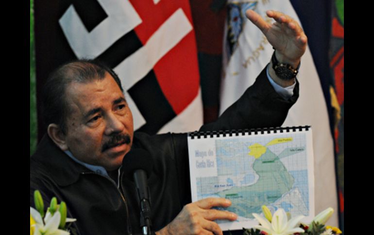 Daniel Ortega muestra un mapa de la frontera entre su país y Costa Rica, durante una conferencia de prensa. AP  /