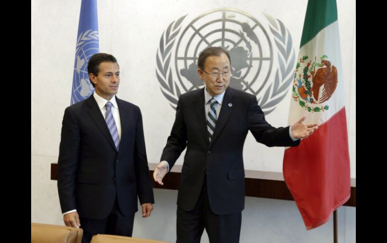 México | Peña Nieto se reunió con Ban Ki-moon para fortalecer la relación entre México y la ONU México refrenda apoyo a los afectados de Medio Oriente Peña Nieto se reunió con Ban Ki-moon, con el objetivo de fortalecer la relación entre México y las Naciones Unidas Por: NTX 21 de septiembre de 2014 - 18:00 hs Peña Nieto y Ban Ki-moon intercambiaron puntos de vista sobre los retos que enfrenta la humanidad. EFE J.Szenes / NUEVA YORK, ESTADOS UNIDOS (21/SEP/2014).- El Presidente Enrique Peña Nieto refrendó ante el secretario general de la ONU, Ban Ki-moon, el apoyo de México para atender las necesidades humanitarias ocasionadas por los conflictos en Siria, Iraq y la Franja de Gaza. En su primer día de actividades en esta ciudad, dijo que la política exterior mexicana siempre ha privilegiado las soluciones políticas y negociadas frente a estos conflictos, en apego al derecho internacional y a la Carta de la Organización de las Naciones Unidas ( ONU). Peña Nieto se reunió en privado con Ban Ki-moon, con el objetivo de fortalecer la relación entre México y el sistema de las Naciones Unidas, así como intercambiar puntos de vista sobre los retos globales que enfrenta la humanidad. El Mandatario mexicano destacó el compromiso de México con la definición e integración de la Agenda de Desarrollo Posterior a 2015, en la que se aborde eficazmente las causas de la pobreza y la desigualdad. Manifestó también el compromiso de México en la lucha contra el cambio climático y felicitó al secretario general por su convocatoria a la Cumbre del Clima 2014 en el marco del actual periodo de sesiones de la Asamblea General de la ONU. Asimismo, agradeció la invitación hecha para copresidir, junto con la presidenta de la República de Corea, Park Geun-Hye, la mesa temática sobre el financiamiento al combate del cambio climático, que se llevará a cabo en dicha cumbre. Externó el beneplácito de nuestro país por el resultado de la Primera Reunión de la Alianza Global para la Cooperación Eficaz al Desarrollo, realizada en México en abril pasado, en la que participó el Ban Ki-moon. Finalmente, Peña Nieto dio la bienvenida a la celebración de la Primera Conferencia Mundial sobre los Pueblos Indígenas, a realizarse esta semana en las Naciones Unidas. Temas Gobierno de México Enrique Peña Nieto ONU Ban Ki-moon Siria Recibe las últimas noticias en tu e-mail Todo lo que necesitas saber para comenzar tu día Registrarse implica aceptar los Términos y Condiciones